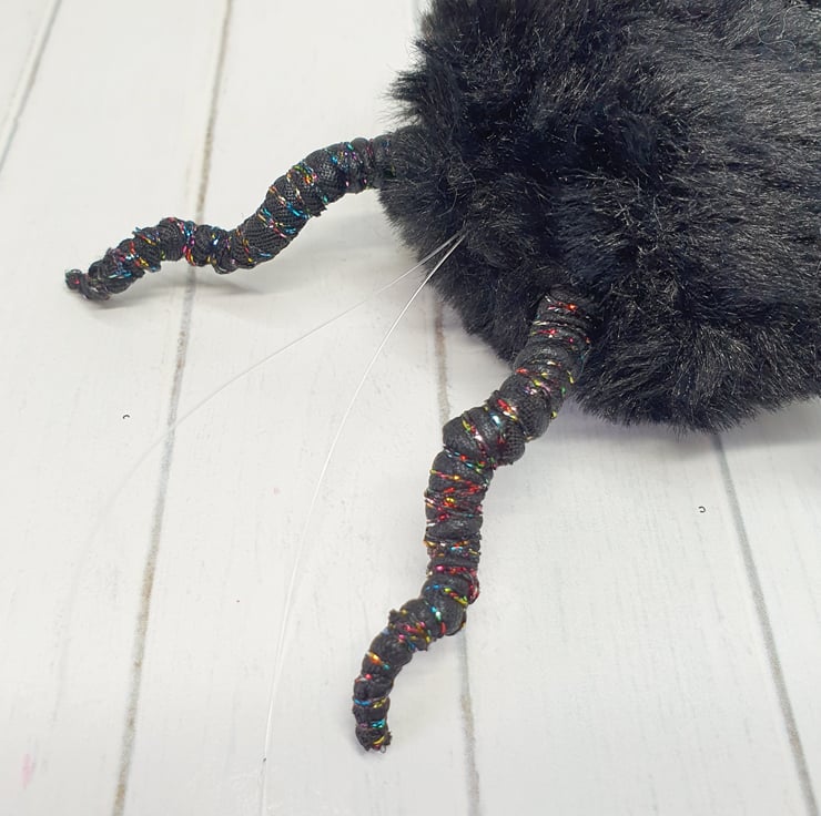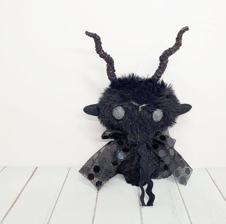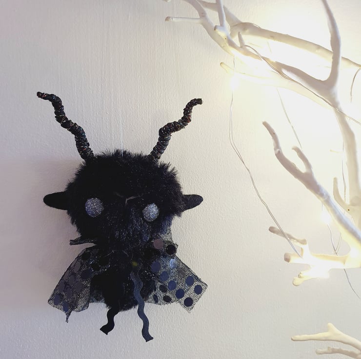 This magical creature is made from soft faux fur. They have sparkly dark eyes and hand stitched details with felt ears. This Wisp wears a sequined lacey cape with ric rac trim. The antlers are made from twisted wire covered in upcycled pvc and sparkly muticoloured black thread and are sewn into place. This one of a kind art doll measures roughly 14cm tall and comes with a transparent loop hanger. This is made for decorative purposes only and is not a toy.