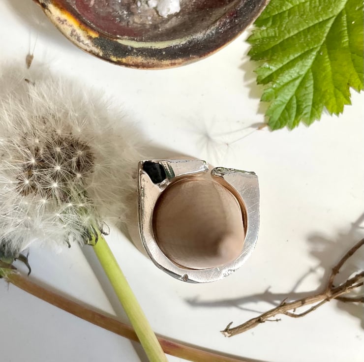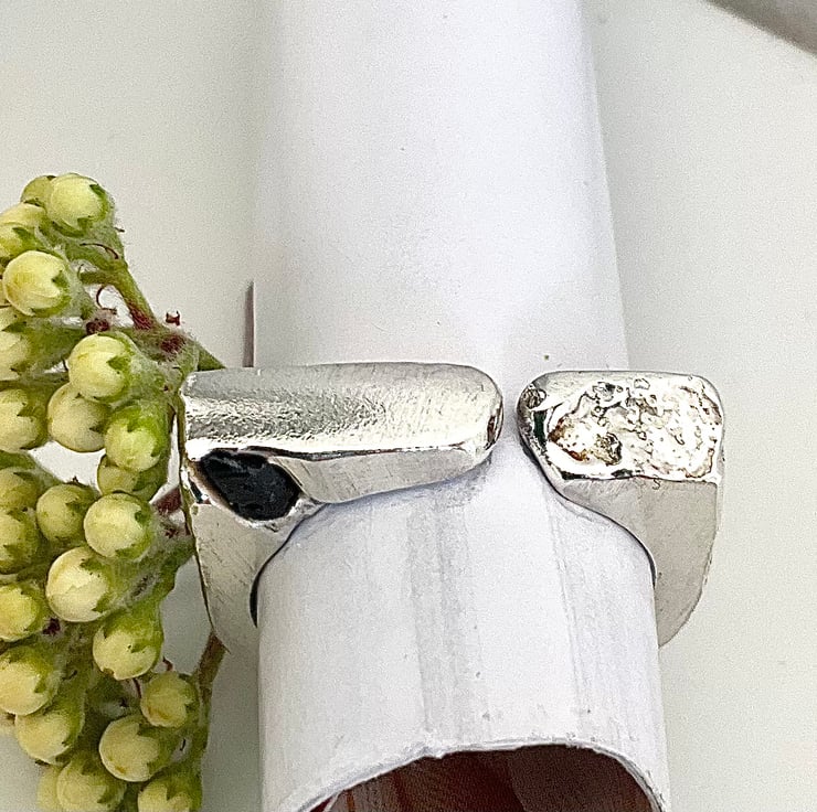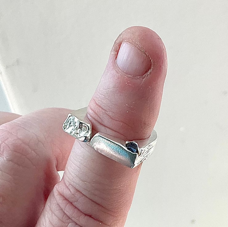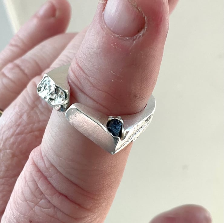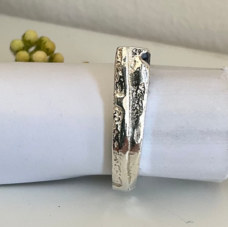 This is a gorgeous sterling silver ring featuring a raw sapphire. The ring has been created by sand casting. I like my rings to be very organic in appearance which can be achieved through sand casting. The ring is open at the top which means the ring has a little give in it.