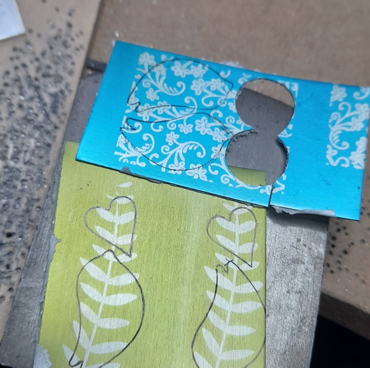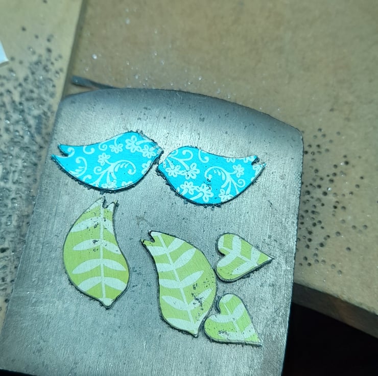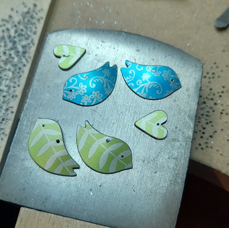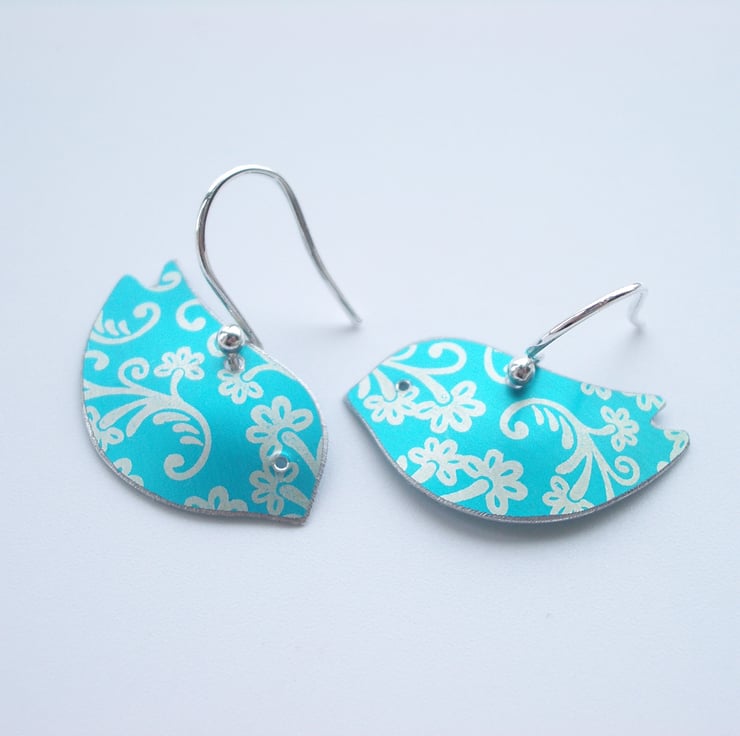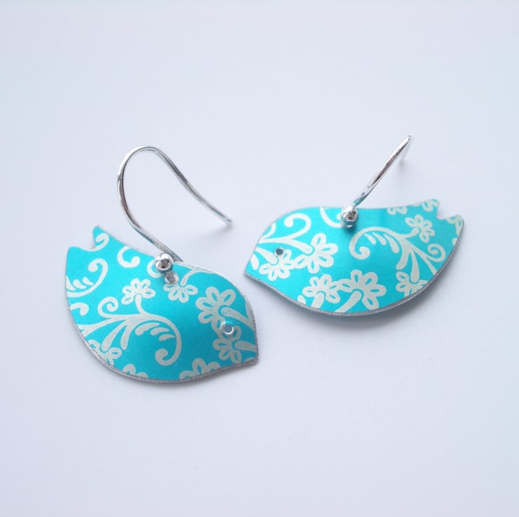 These bird earrings are made from aluminium which I have dyed and printed in turquoise with contrasting silver flower prints. The bird shape is all hand cut using a piercing saw and I finish the edges with a file. Finally, I dome the bird slightly to give it depth and to make it catch the light.