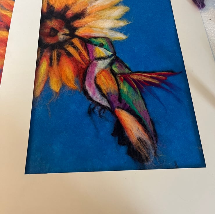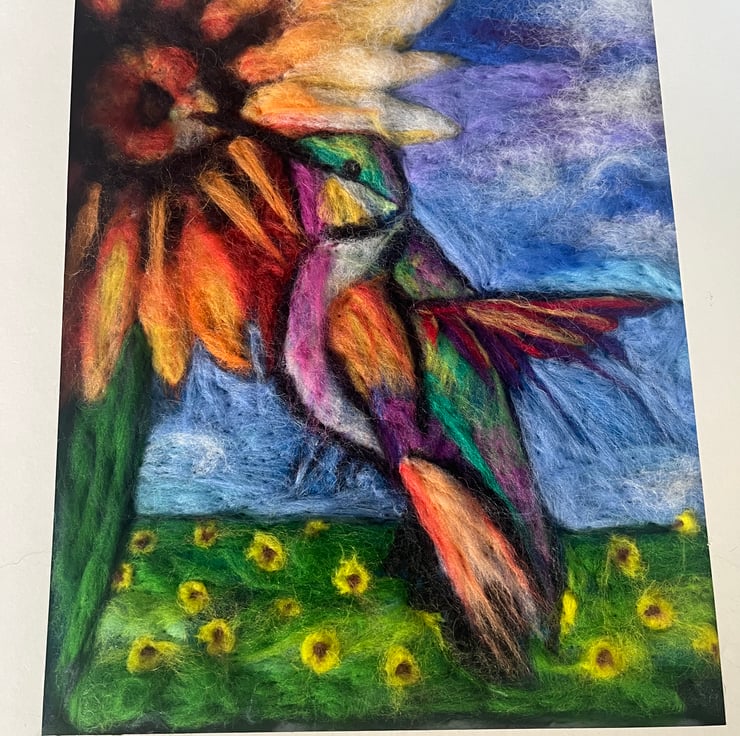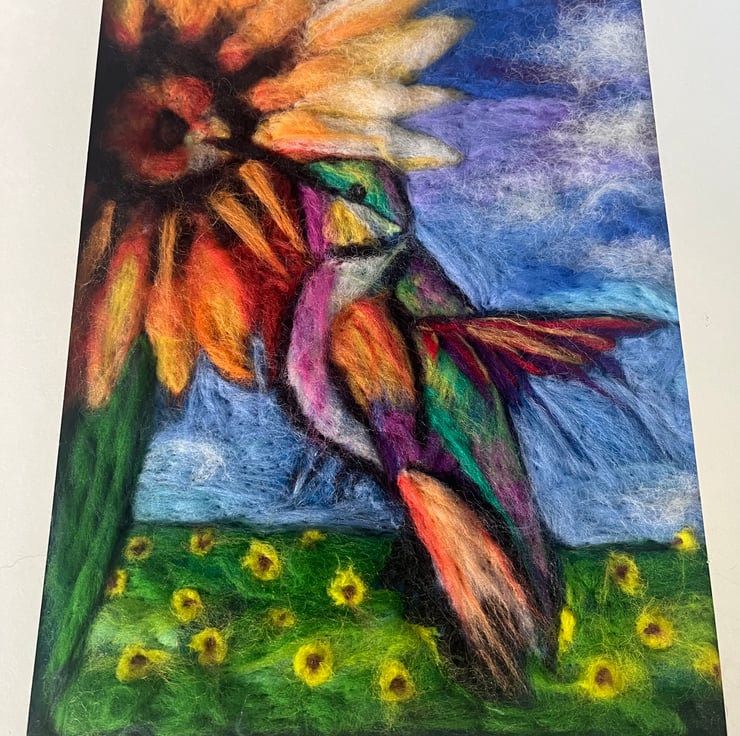 A vibrant depiction of a hummingbird hovering next to a giant sunflower set against a Spring Colours blue sky and field of sunflowers. A4 in A3 mount. Wool painting, needle felt. Unique original. Handmade.