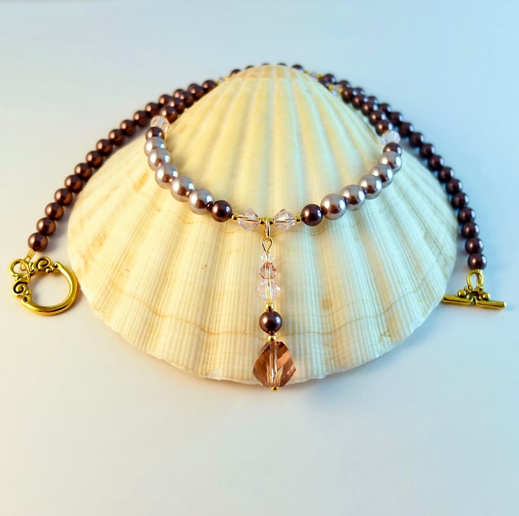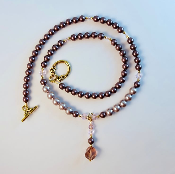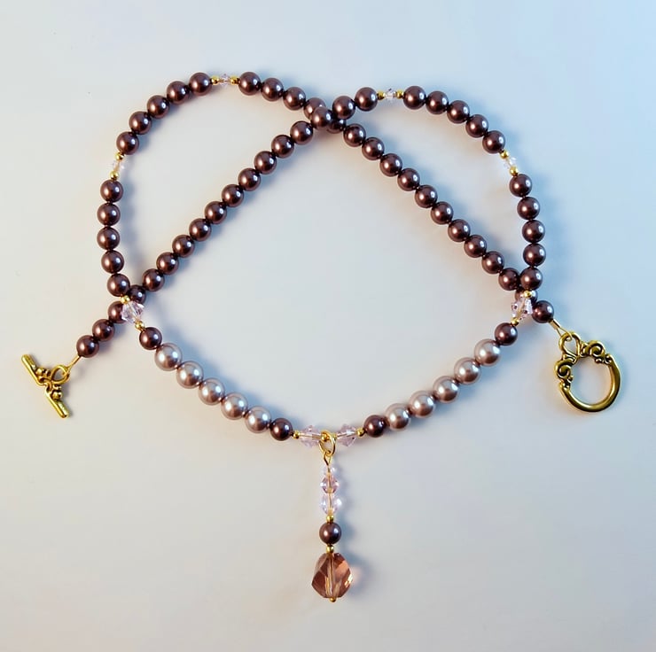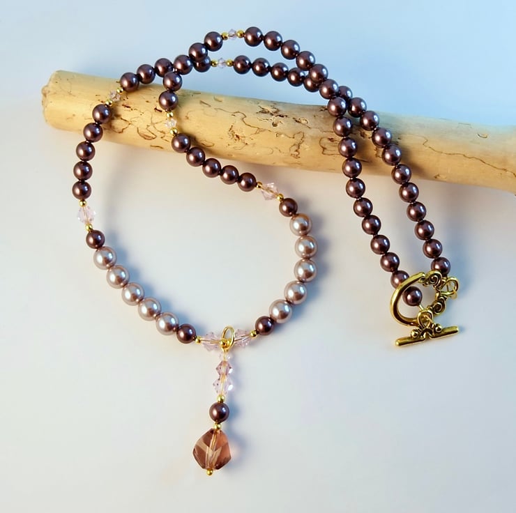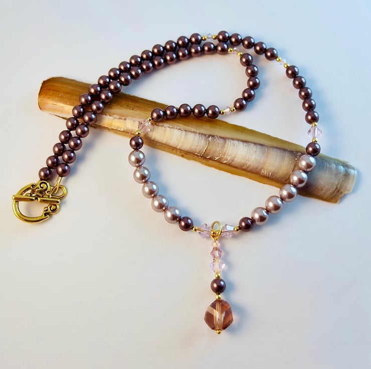 Pretty glass and shell Pearl necklace with sparkly pink Austrian Crystals and a handmade faceted glass drop pendant.
