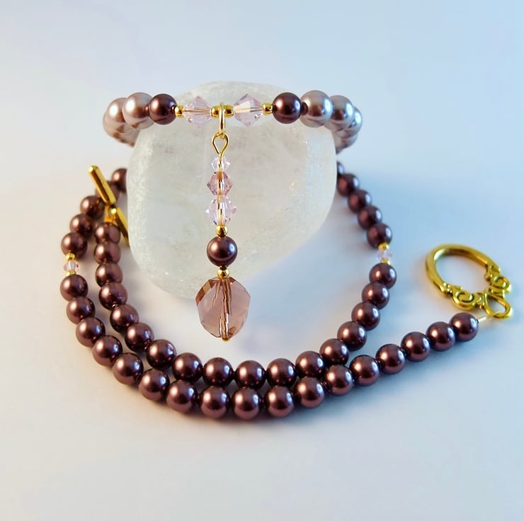 To either side are five 6mm lavender shell Pearls, graduating to 5mm Austrian glass Pearls in the colour 'crystal Burgundy', inset with more sparkly 3mm 'rosaline' bicones, highlighted with tiny 2mm gold vermeil spacers.