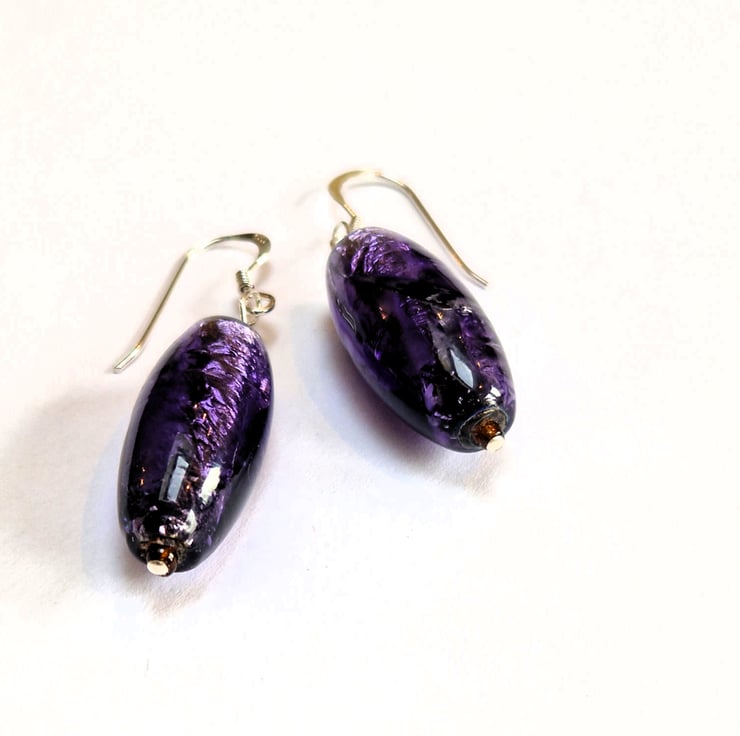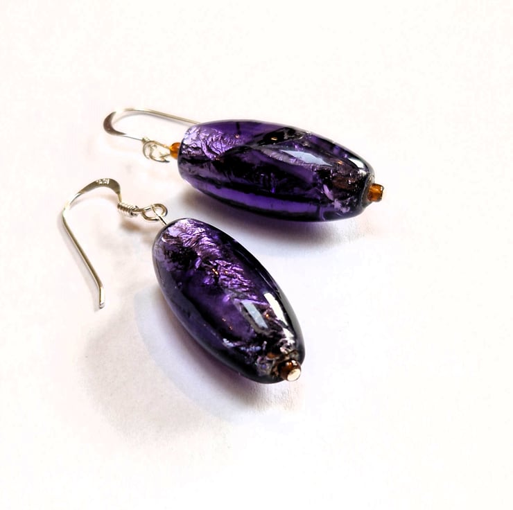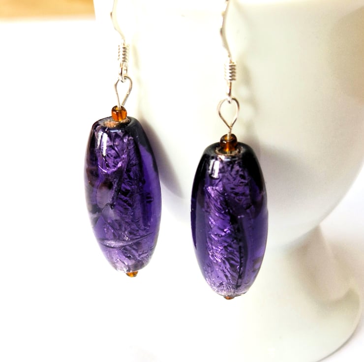Very pretty purple dangle earrings with recycled, foiled glass Art Deco beads and new sterling silver ear wires.