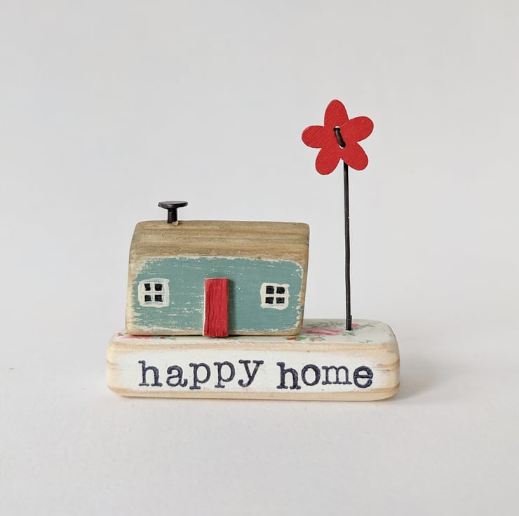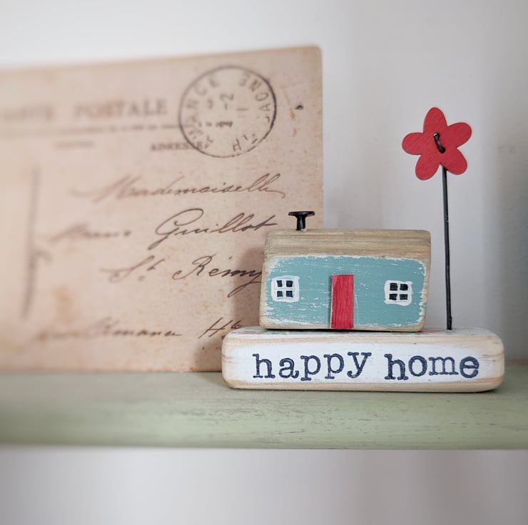 A hand stamped wooden base with a teeny painted house and a jolly heart on a wire to stand beside it.