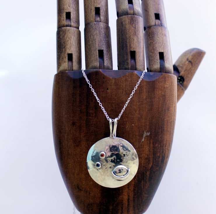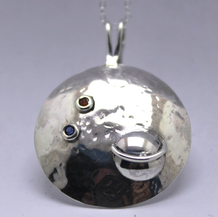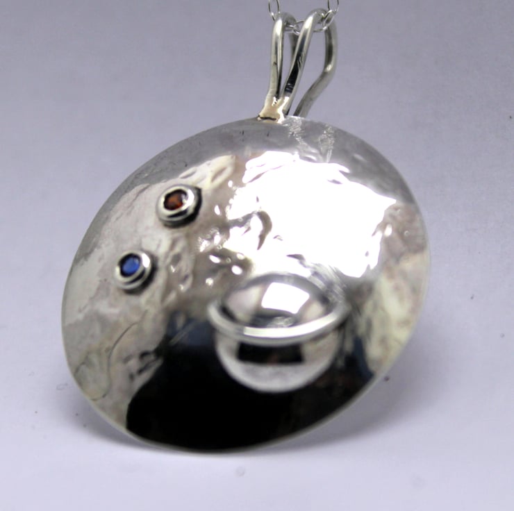 Planet and moon shaped domed pendant, hand made from Sterling Silver with two CZ gemstones set to represent craters on the planet, which also add a flash of colour. The planet has a hand hammered texture and the moon has an equatorial ring.