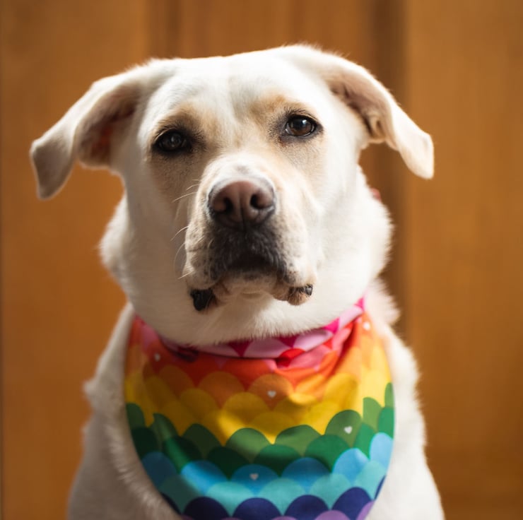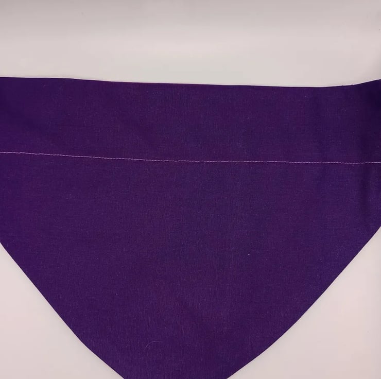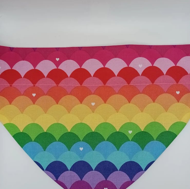 Vibrant rainbow wave cotton fabric dog bandana with purple cotton backing. Attach by slipping a flat dog collar through the top (through 1.5 inch opening) so the bandana is secure. Easy to wash. A fantastic accessory for your canine companion.