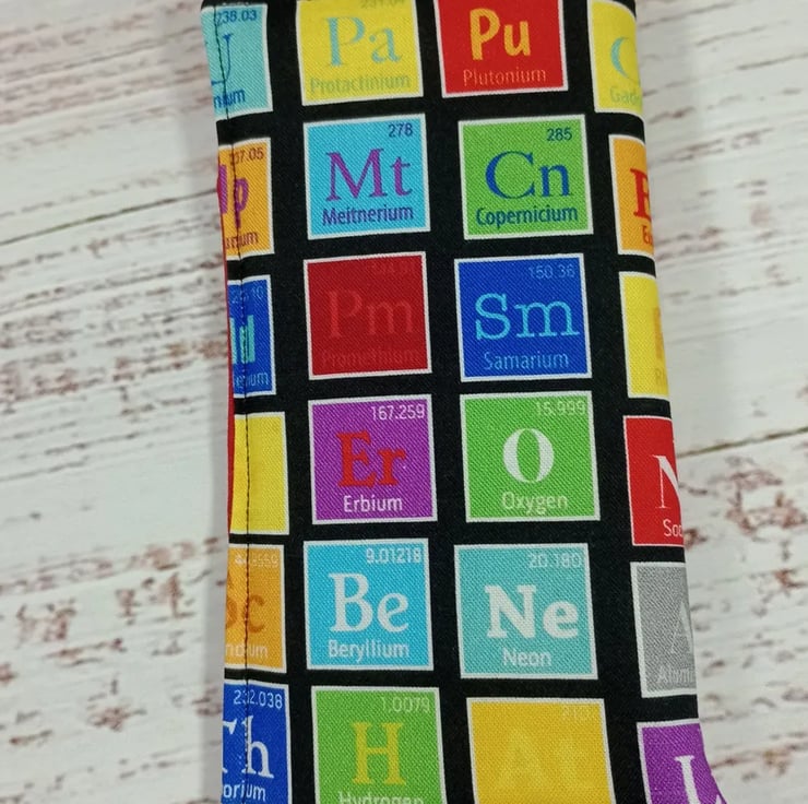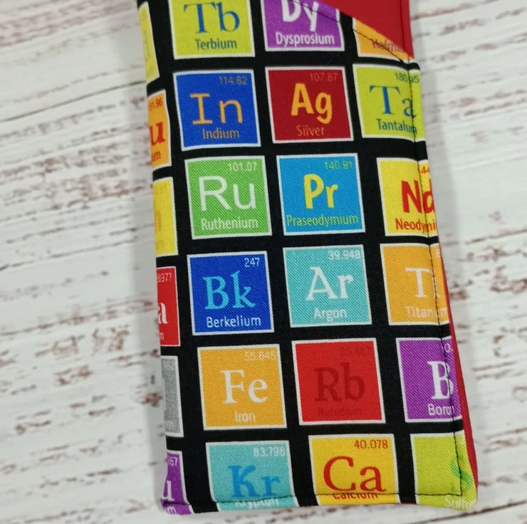 Colourful, fun periodic table padded glasses case. Perfect for sunglasses or glasses. Padded for extra protection. Lined with red cotton fabric. Easy to wash.