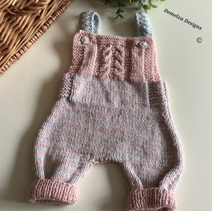 These cosy baby rompers have been hand knitted and designed in Cornwall using premium soft machine washable acrylic yarns. The romper straps have a cable design to match the romper front cable design. The buttons are made with genuine wood with a floral design on them.