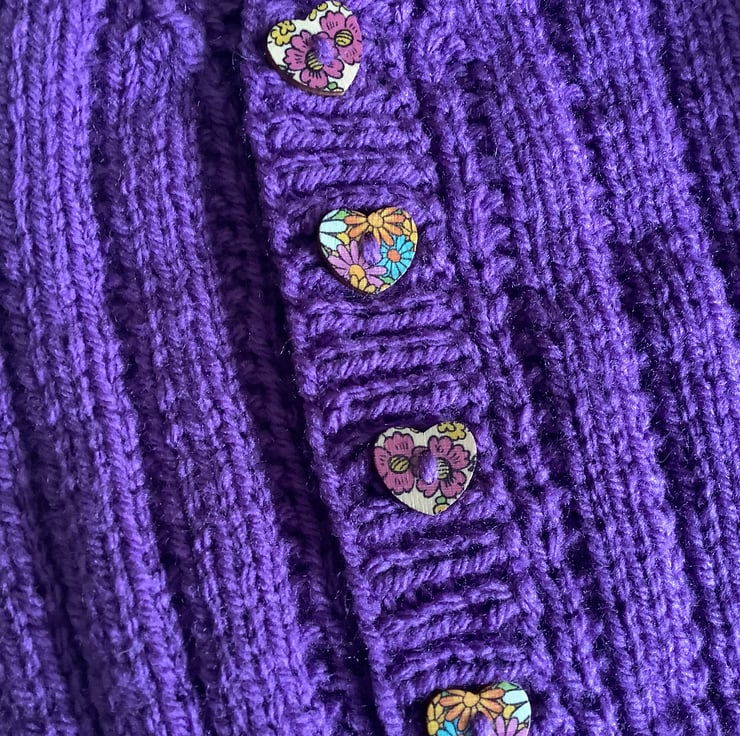 The buttons are made from genuine wood in a heart cut design with a floral print design overlay. On the cardigan back neck the branded luxurious Demelza Designs garment label (also made in Cornwall) has the care instructions woven within it on the reverse side for lasting reference. Prior to dispatch a branded Demelza Designs garment swing tag will be attached to the front providing a professional touch, especially if gifting.