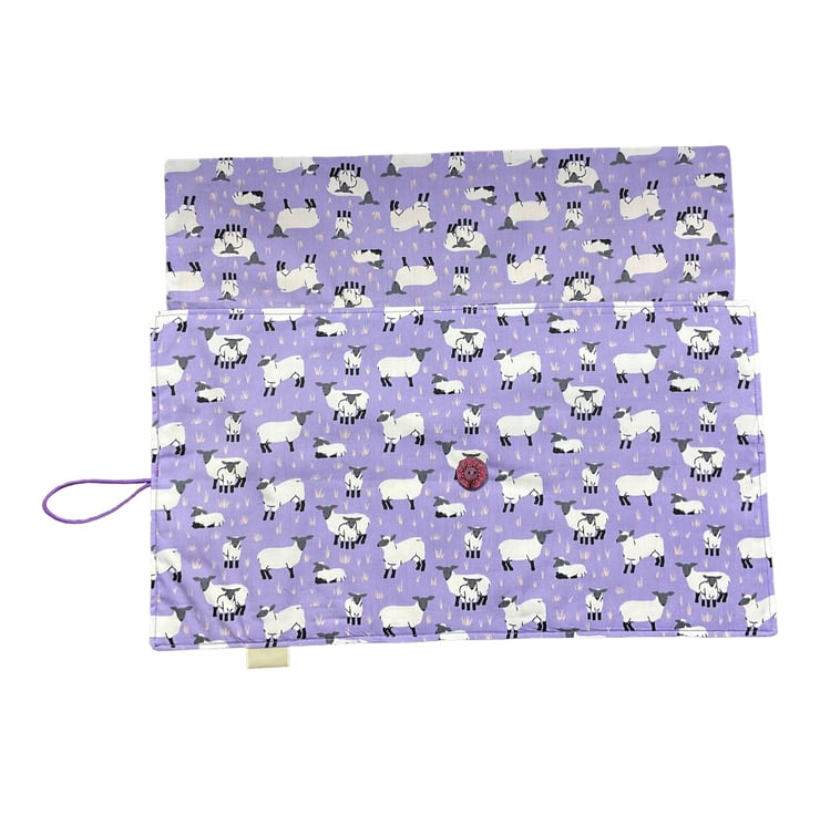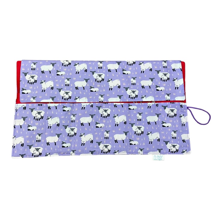 I have used a cute sheep print fabric on a lilac background for the outer, outside of flap and lower pocket and a bright red cotton to line the case and the upper needle pocket. The case is interfaced for structure and strength and topstitched all around for neatness.