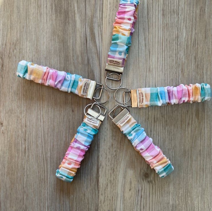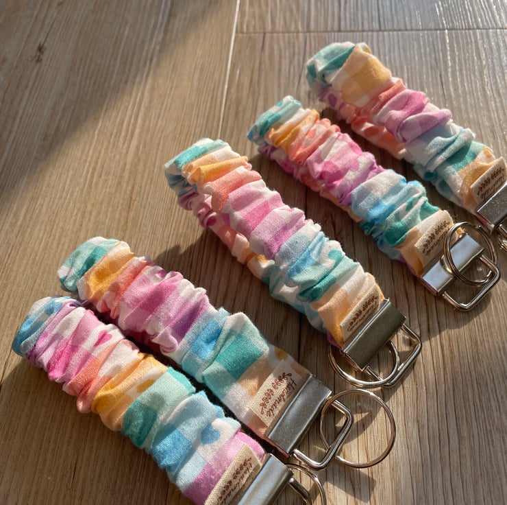 Pastel, rainbow with hearts wristlet keychains perfect for when you have your hands full, no need to dig around in your handbag just pop this scrunchie type keychain around your wrist. Pastel heart chequered fabric design with silver hardware. This keychain and scrunchie bow, makes a perfect gift.