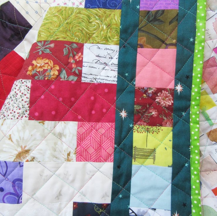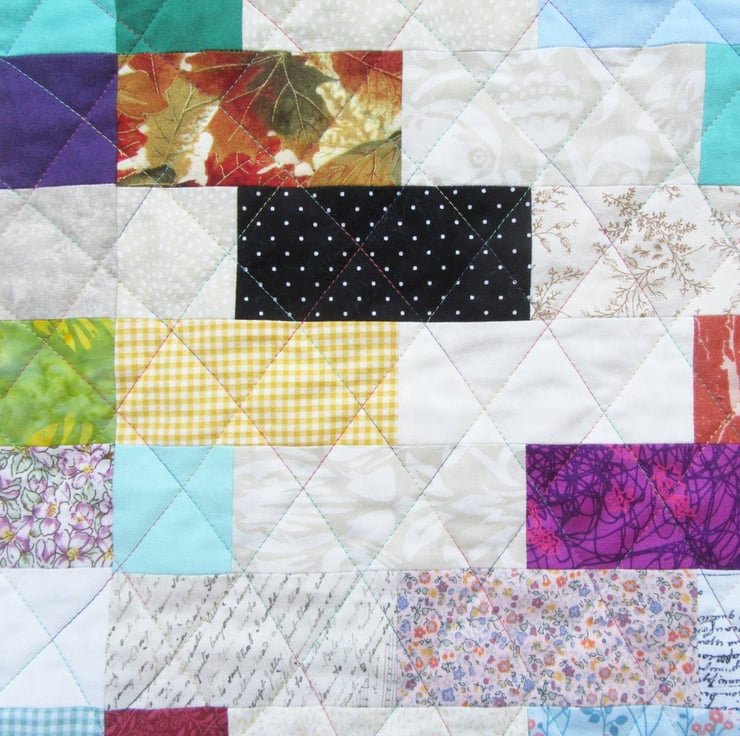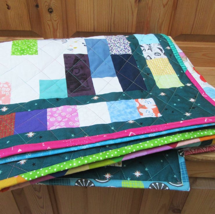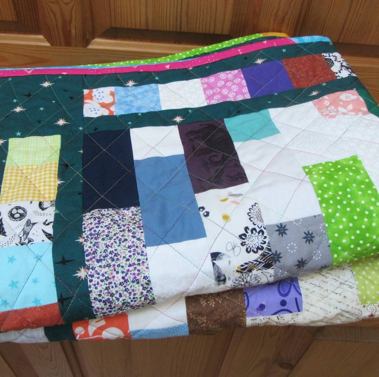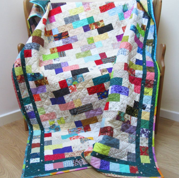 Inside this patchwork throw is a layer of natural, breathable Bamboo/Cotton mix wadding. I've quilted dozens of gentle wavy lines across the quilt to create a grid which adds texture and extra cosiness.