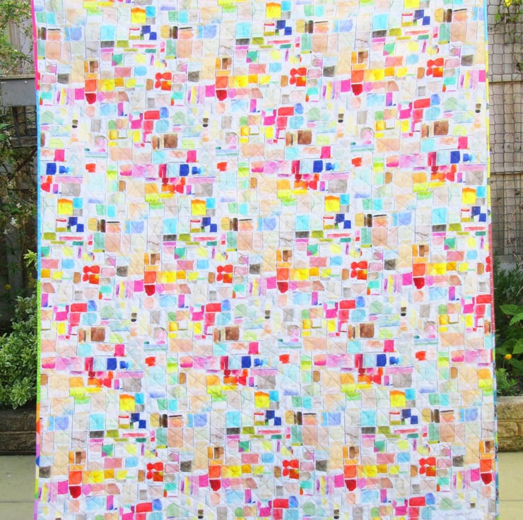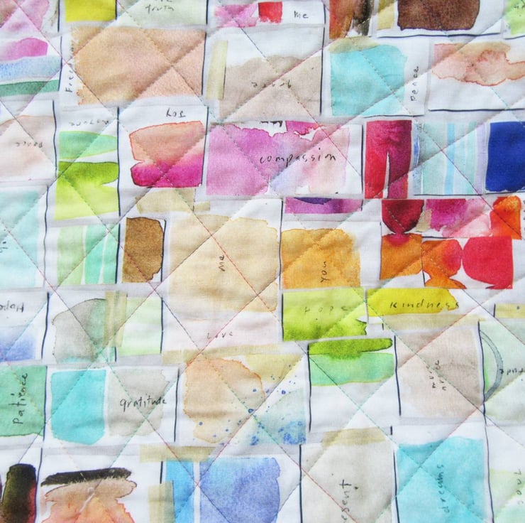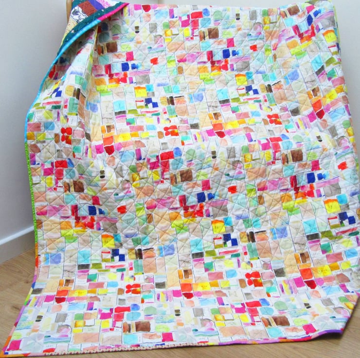 I thoroughly enjoyed making this quilted throw from hundreds of pieces of 100% cotton fabrics. The throw is backed with a lively, heart warming print - many of the water-colour swatches have words of mindfulness and encouragement such as 'grace', 'hope', 'patience', 'tenderness', 'letting go' and 'to walk in it'.