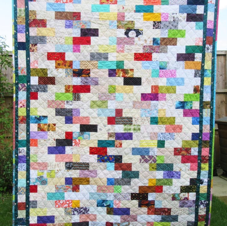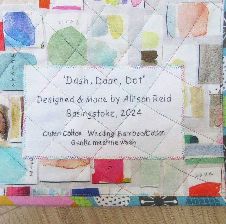 Designed and made in my smoke-free, pet-free home sewing studio. I've named the quilt 'Dash, Dash, Dot' as the patchwork uses sequences of rectangles and squares that put me in mind of Morse code symbols. There is a label on the back of the quilt with it's name and other details.