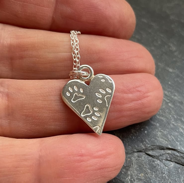 Silver Paw print pendant in the shape of a heart hangs from a silver chain.