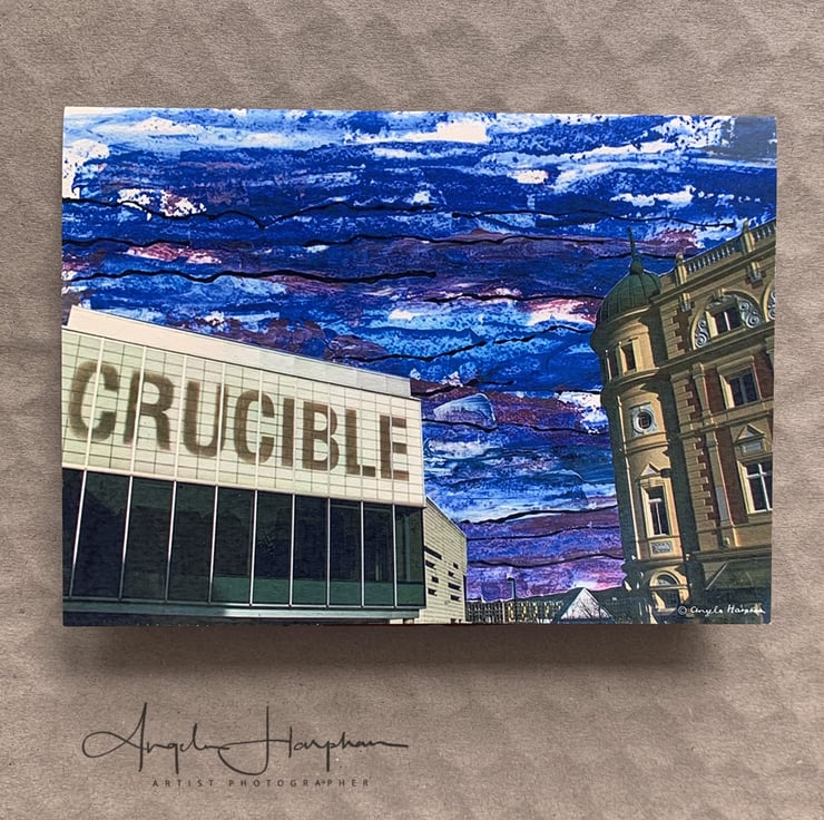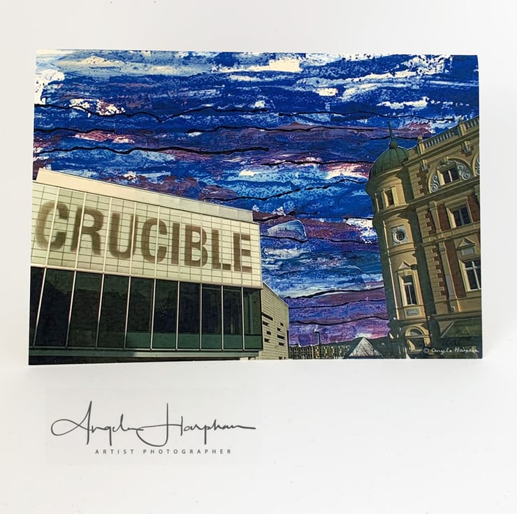 A combination of two of the theatres in Sheffield, added to an acrylic painting to give the drama of dusk on a summer visit to the theatre, and now as a card.