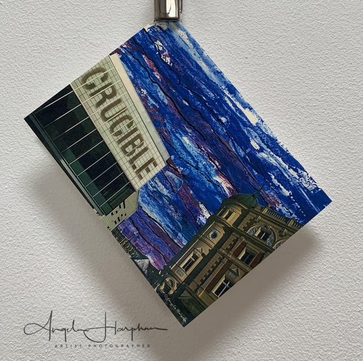 A combination of two of the theatres in Sheffield, added to an acrylic painting to give the drama of dusk on a summer visit to the theatre, and now as a card.