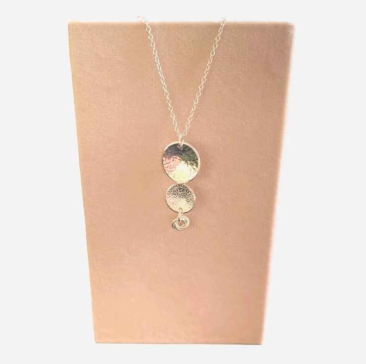 Sterling silver necklace with textured discs and a small “love knot” to finish it off. Textured discs catch the light and give interest. Approx length of piece is 3.5cm and it hangs from a sterling silver adjustable chain which can be worn at 16” or 18”.