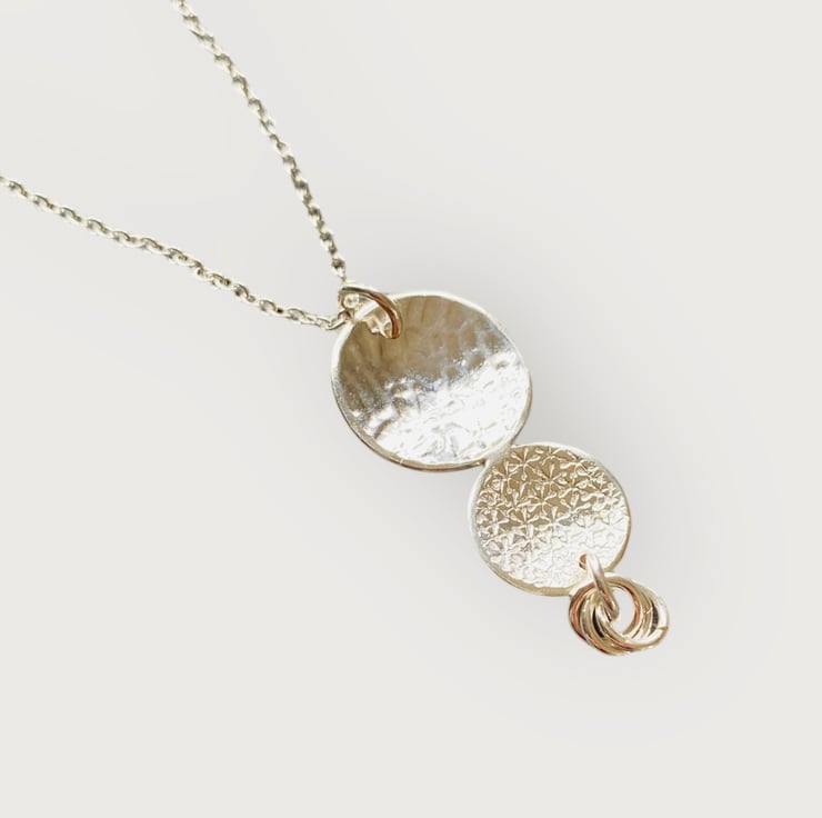 Discs are cut from sterling silver sheet and textured by hammering or passing through the rolling mill. Texturing gives interest and catches the light. Interlinked rings form the bottom part.