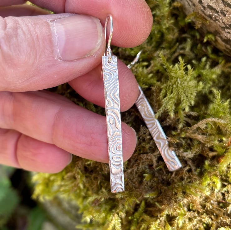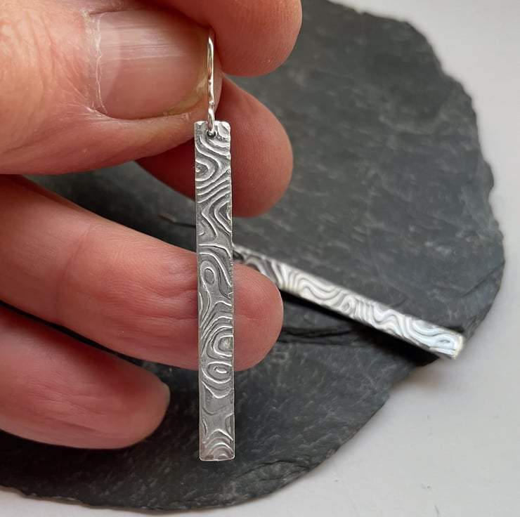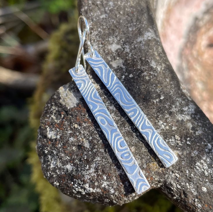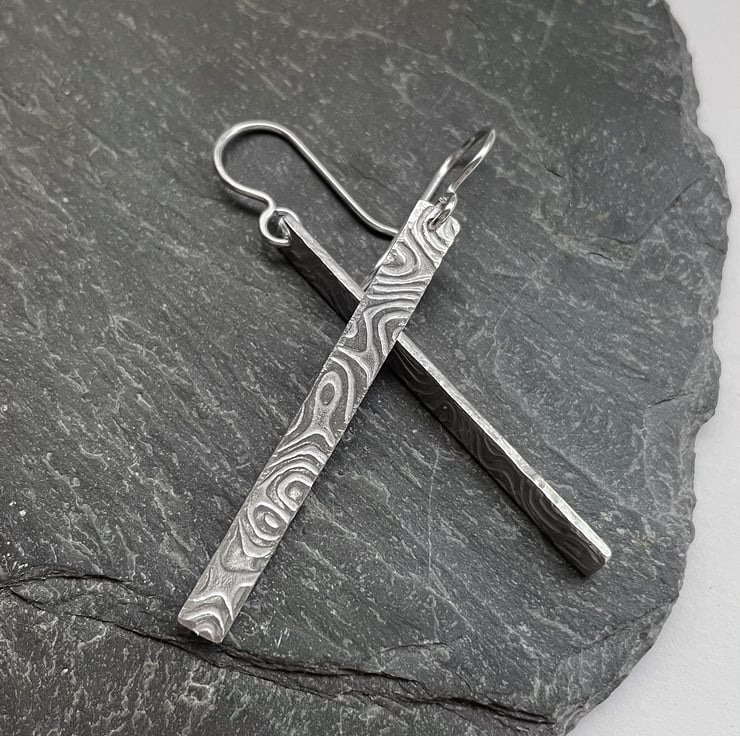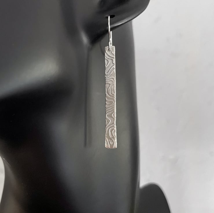 Thick silver sheet has been patterned, then cut into long strips. These are hung from handmade hook ear wires.
