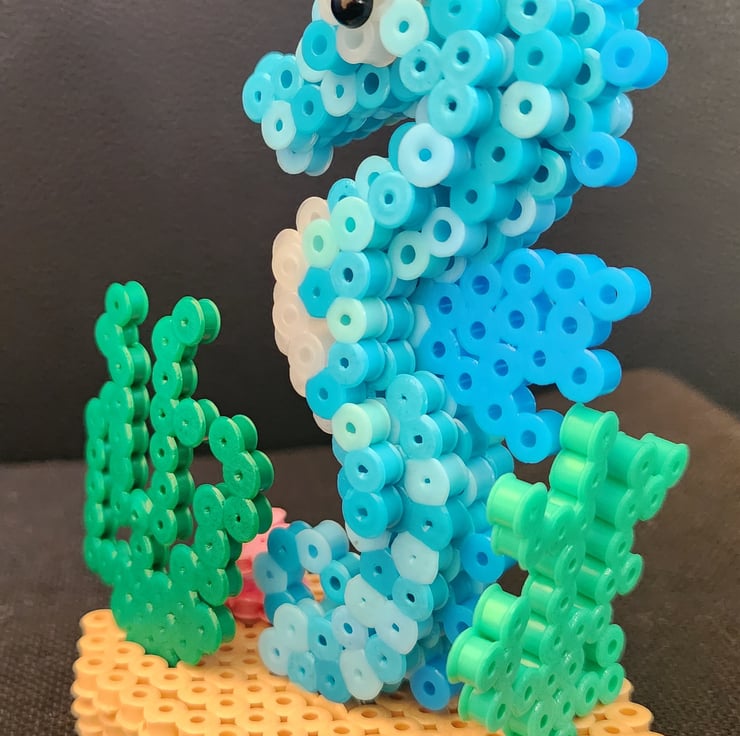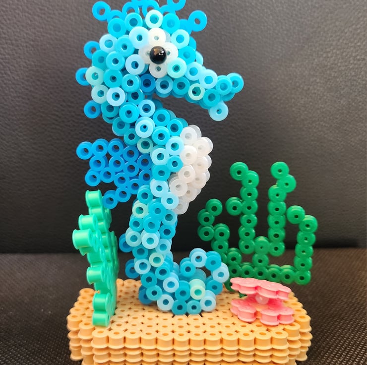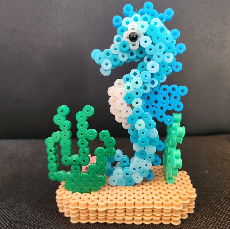 Add a touch of the sea to your home decor with this beautifully crafted 3D seahorse ornament. Handmade with care, this small piece measures 11.5cm in height and 8cm in length. Made of hama beads , it features intricate details that bring the sealife theme to life.