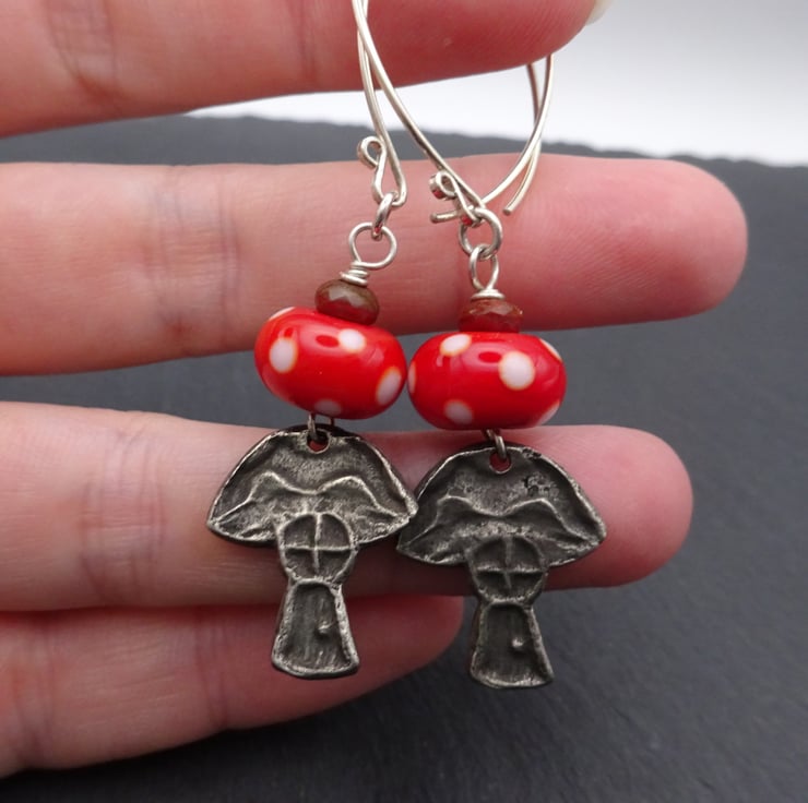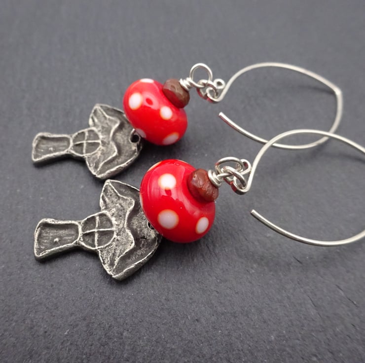 A pair of earrings made with handmade sterling silver ear wires, my handmade lampwork glass beads which are red with white polka dots and a pair of handmade pewter toadstool house charms.