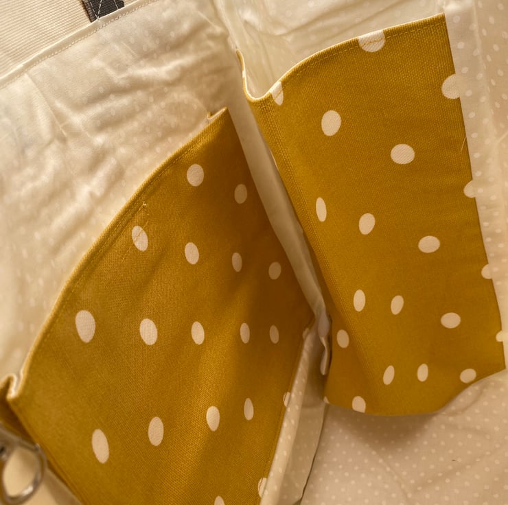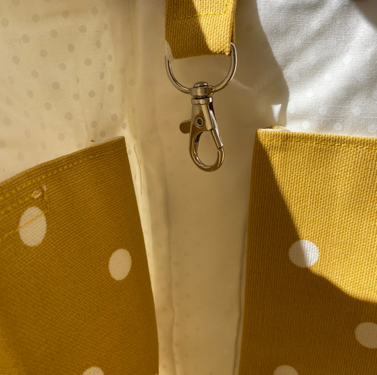 A handy little key fob has been sewn in to clip keys on so you are not rummaging to the bottom of the bag looking for your keys. All fully lined with 100% cotton, and machine washable at 30 degrees. This bag has a structured base, remove the base from its sleeve before washing. DO NOT TUMBLE DRY.