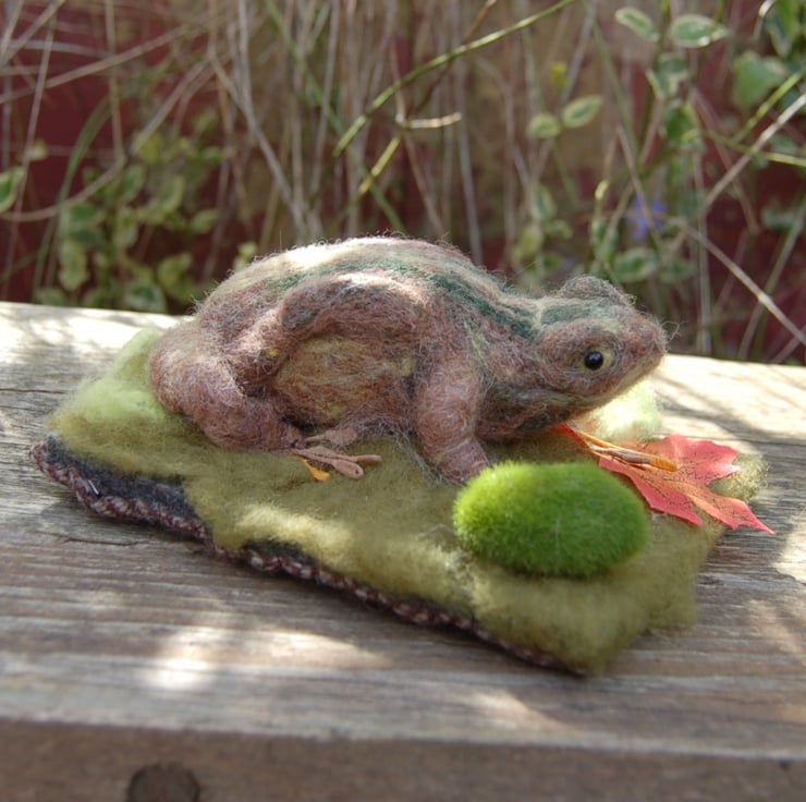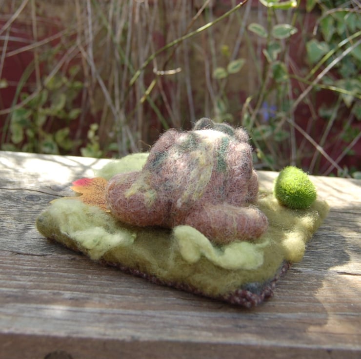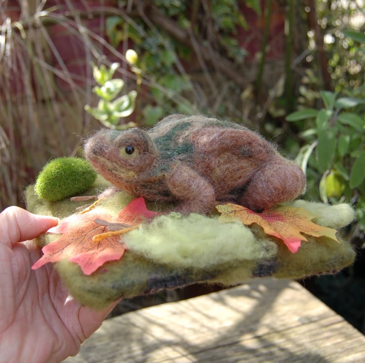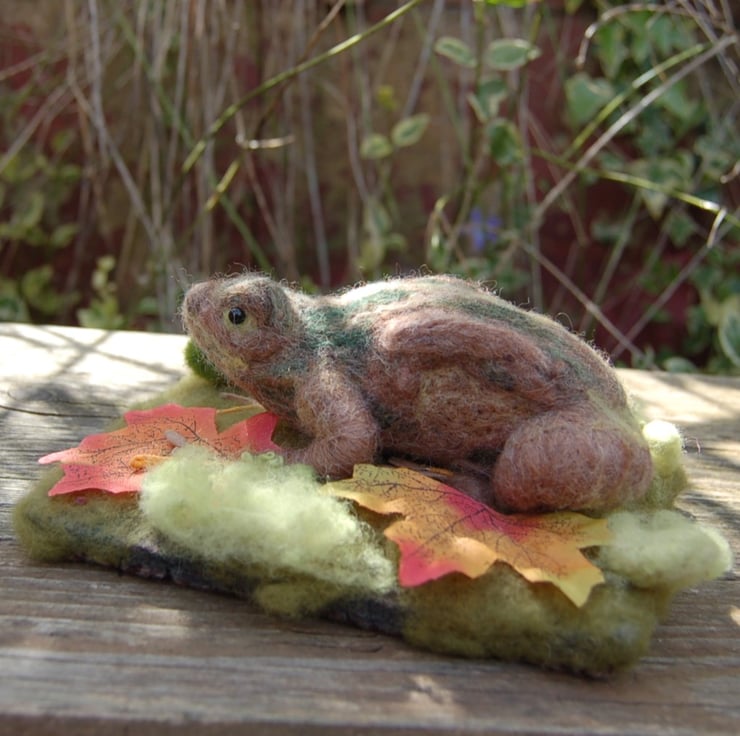 The frog is made using wool fibres over a wire frame and needle felted into shape using a sharp barbed needle. The frog is sewn onto a wool base covered with green wool fibres for grass and moss and a couple of leaves. The base is backed with a piece of wool fabric.