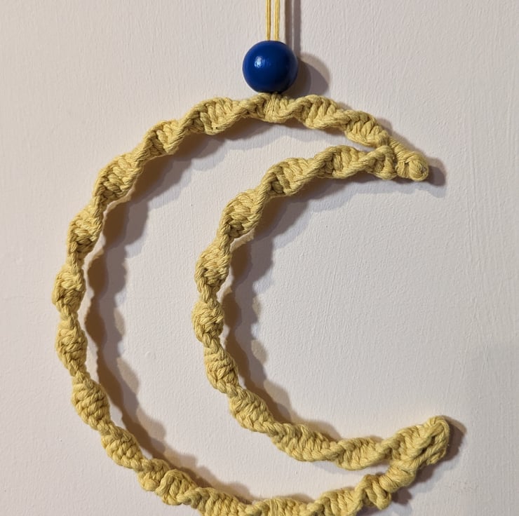 A fun decorative wall hanging made with brightly coloured cotton cords in red, yellow and blue and featuring 2 moons. This would make a lovely addition to a little one's nursery or just to add some colourful bohemian chic to your home.