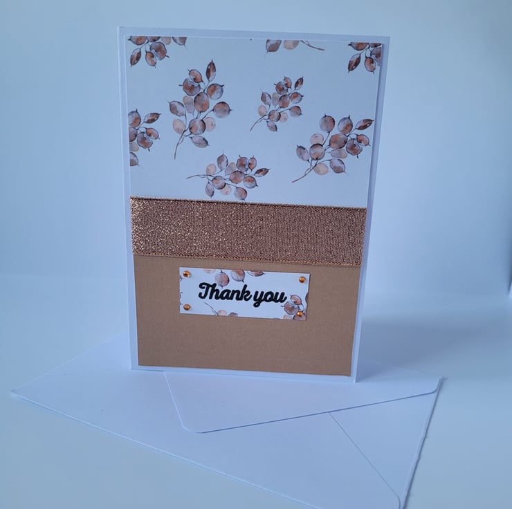 Featuring a clean foliage design on the top half, rose-gold ribbon in the centre, and coordinating textured cardstock in a tan colour at the bottom, this thank you card would be a great way to say thanks in a beautiful way.