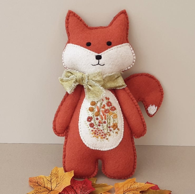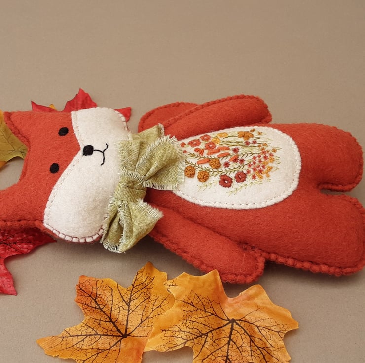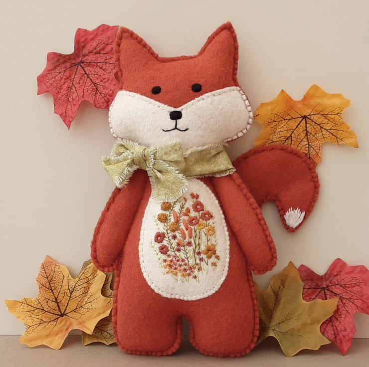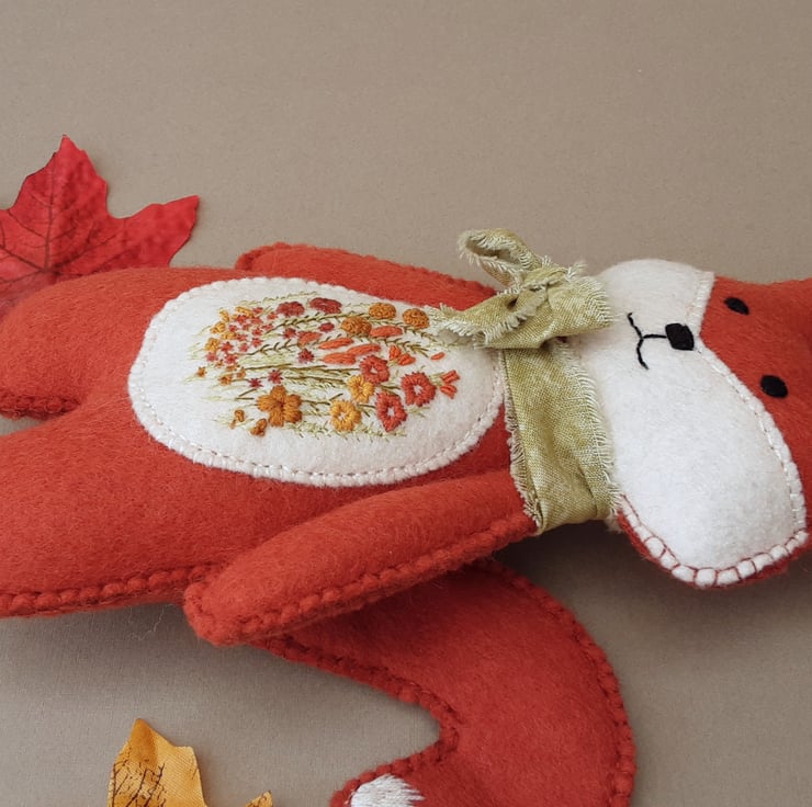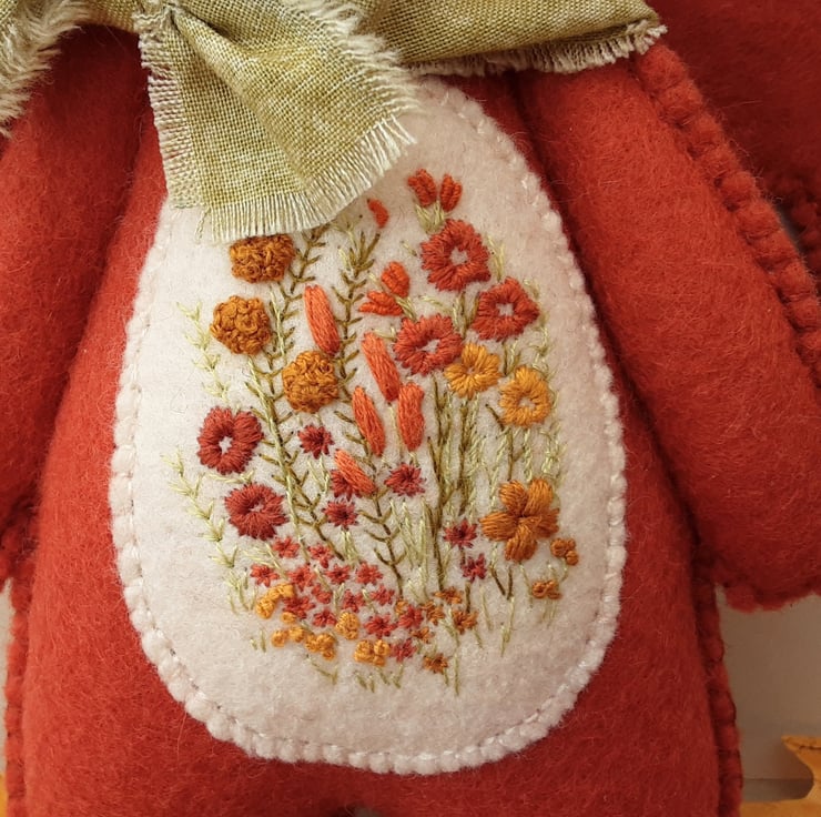 He has hand embroidered floral details to his body in colours to match and compliment his colouring including rusts, mustards, terracotta, greens and oranges, stitched using 1 and 2 strands from 6 stranded DMC threads.