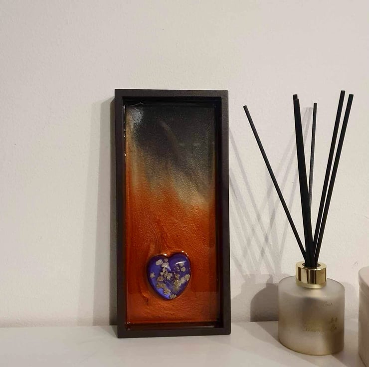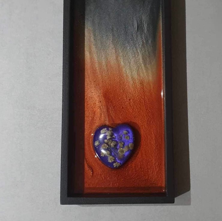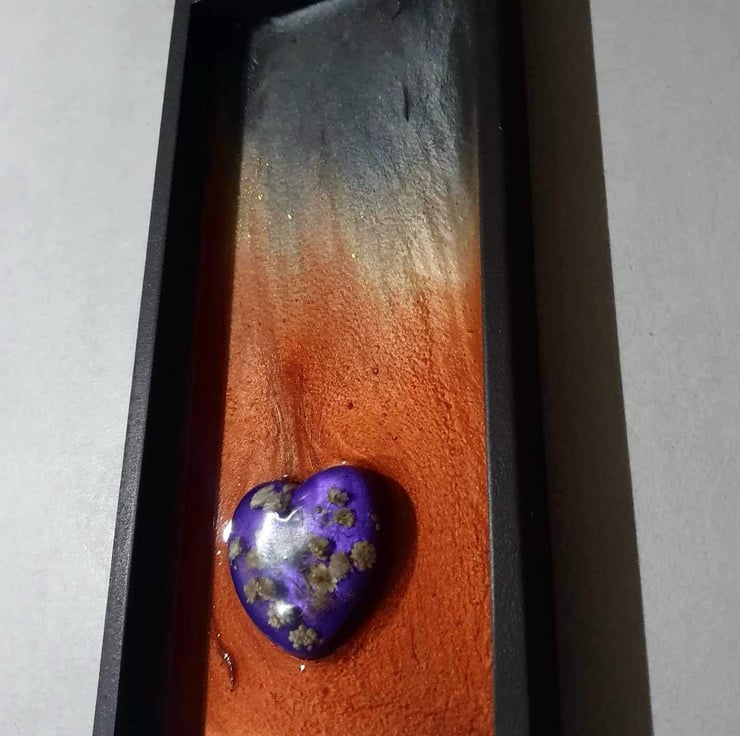 I created a resin heart with baby’s breath encased on a deep Pearl purple resin. Representing earth and nature.