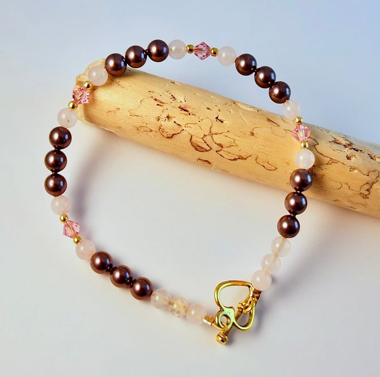 The crystals are highlighted with tiny gold vermeil spacers, and the bracelet fastens with a sweet Tibetan style heart shaped toggle clasp that is nickel and lead free.