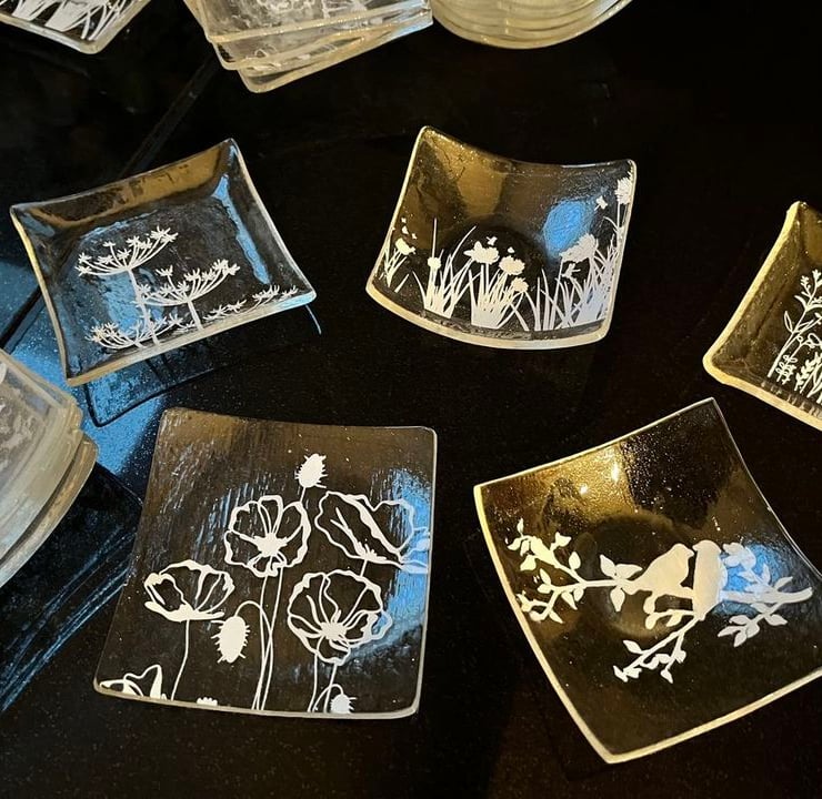 I was originally a painter....sold my work world wide and won awards...I would paint, teach and write but eventually moved from painting to working with glass when I was unable to easily paint after medical problems. Now, the kiln does half the work! Shaky hands meant I could not easily sketch, so I began to use silkscreens on my glass...you can see some of the pieces in the photos - and realised I could use my writing skills to teach what I had learned. I have many happy customers!