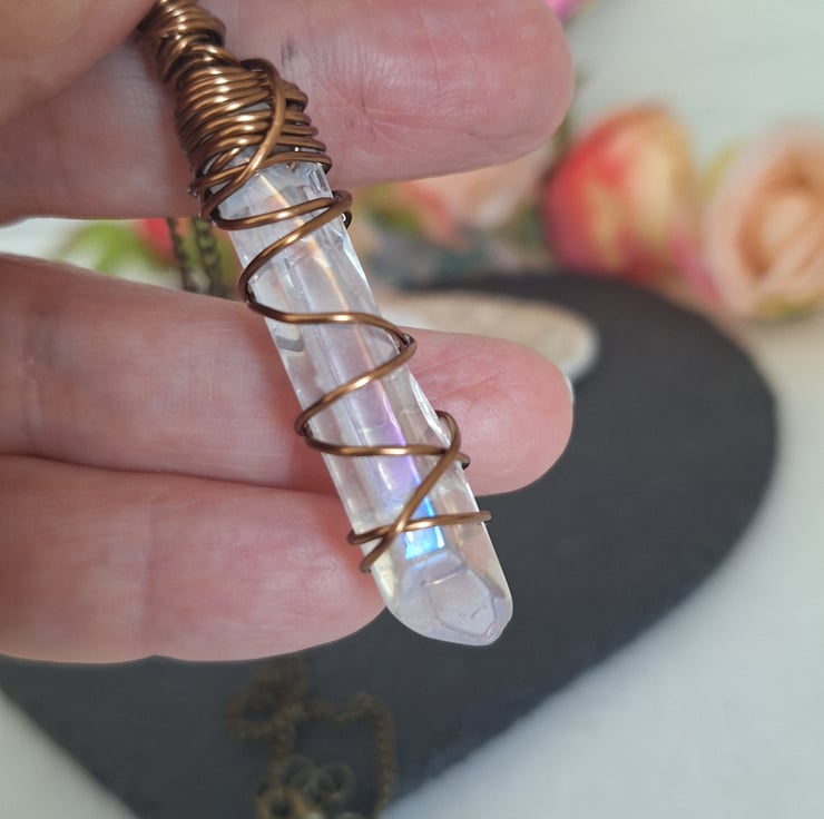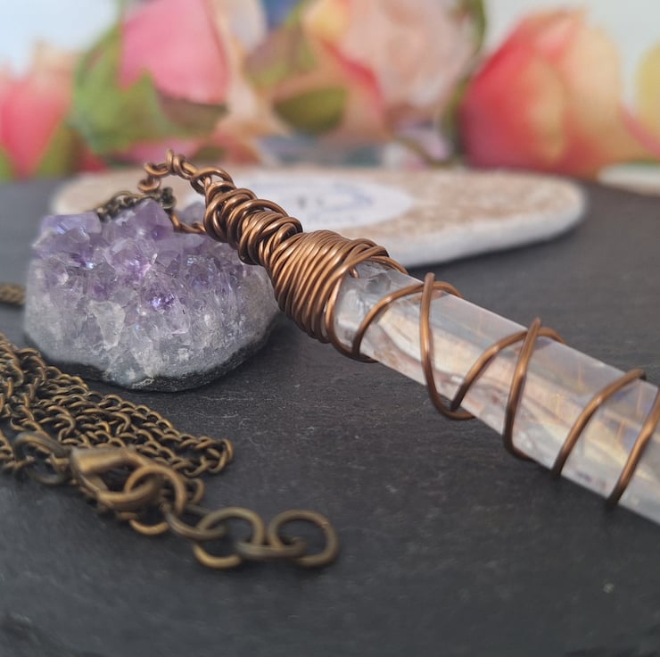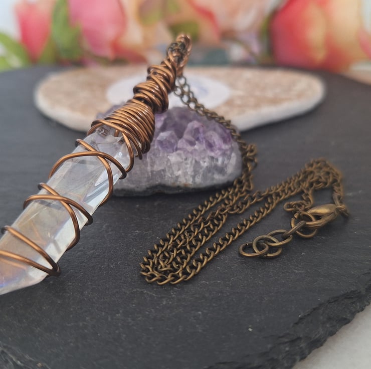 This is a delightful titanium quartz dagger, wrapped in bronze plated copper jewellery wire and presented on an adjustable bronze plated chain of 40cm that adjusts to 41cm.