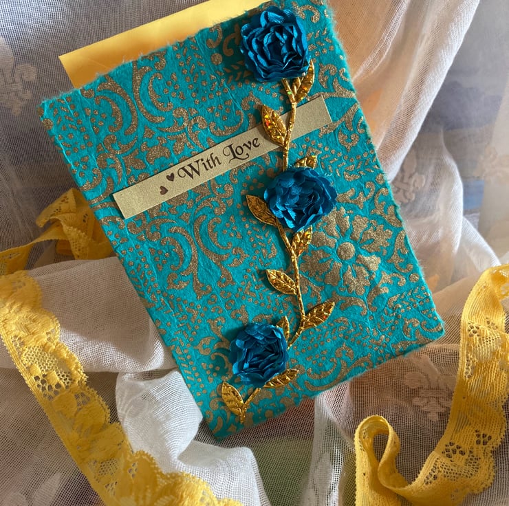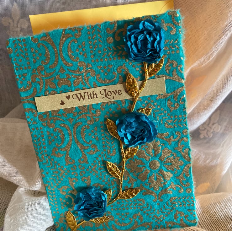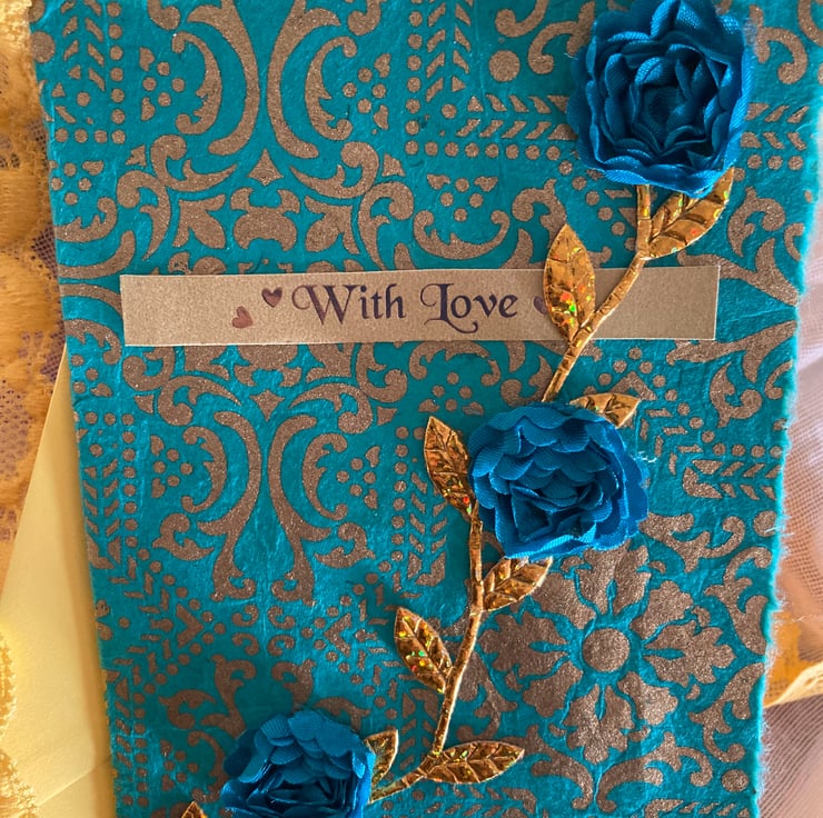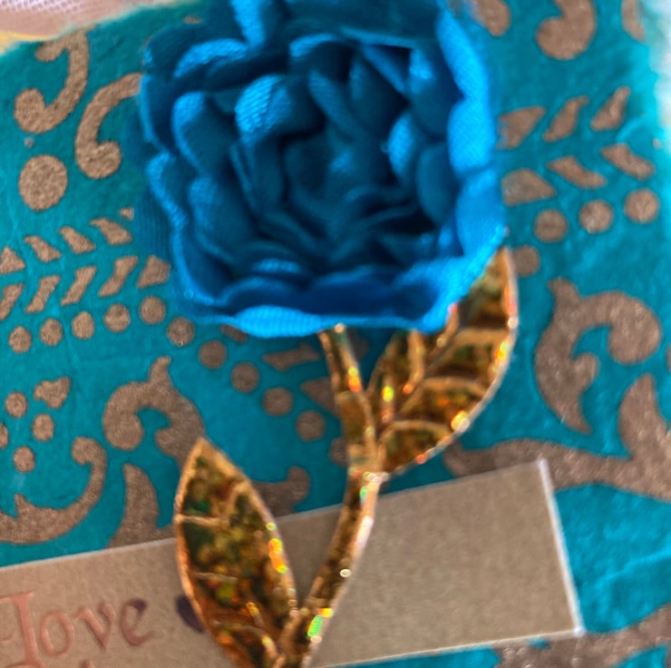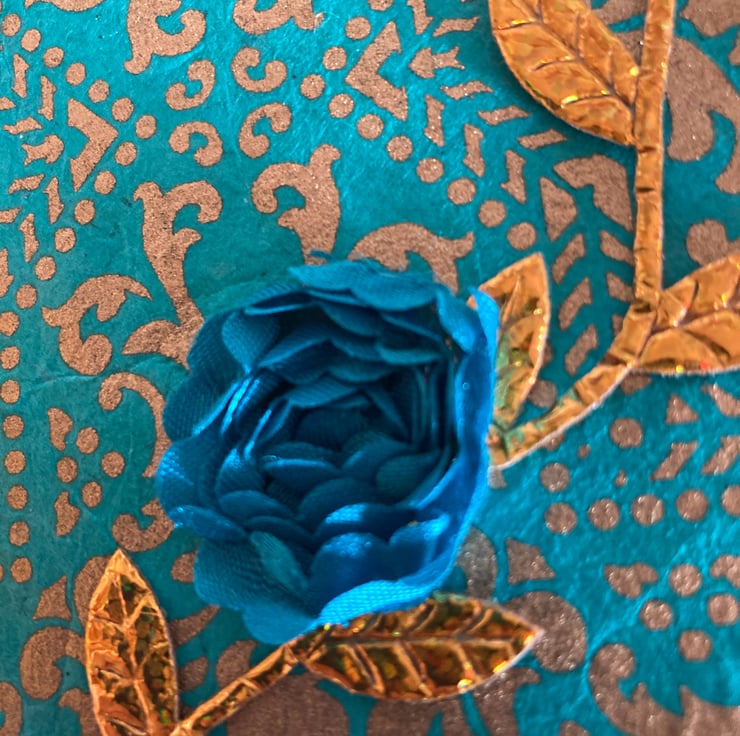 A teal and gold patterned osier covers the front of this card with a gold leaf braid running up the front. 3 teal flowers have been placed along this gold stem.