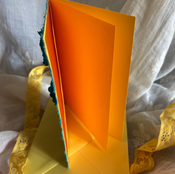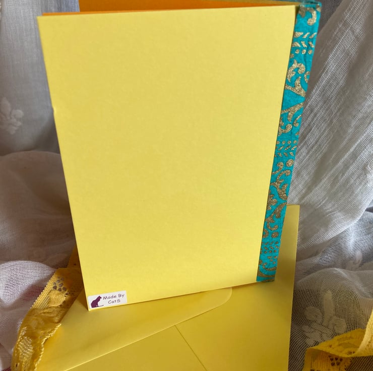This is a yellow card with an orange insert and yellow envelope.