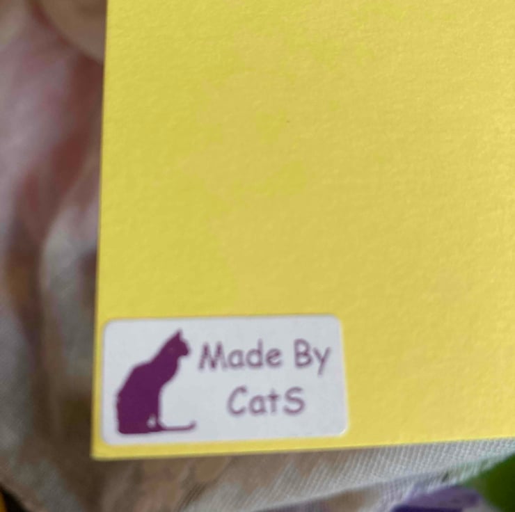 There is a small purple cat on the back saying Made by Cats