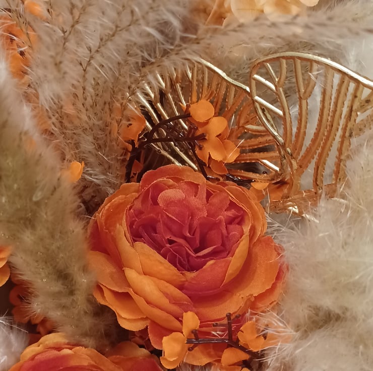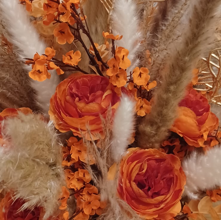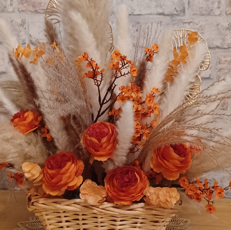 A vintage rectangular wicker basket arrangement, featuring vibrant, bright orange silk flowers, and a range of natural pampas grasses.