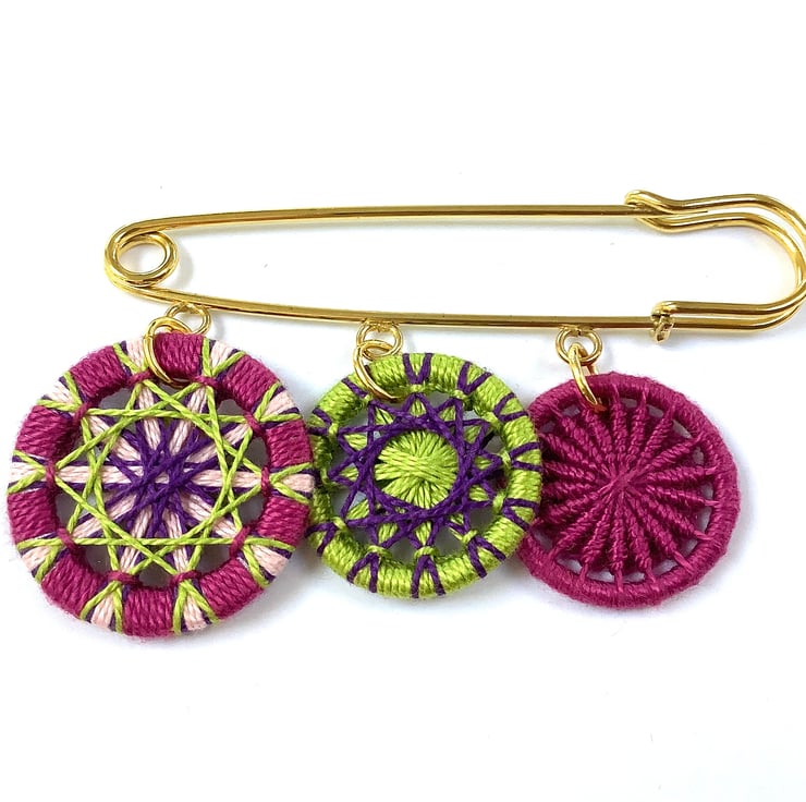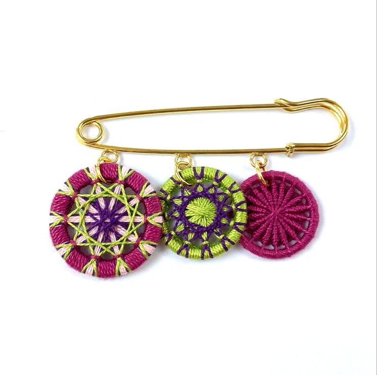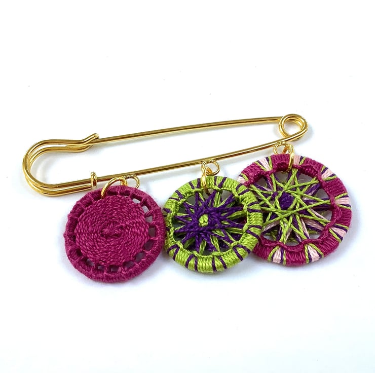 The gold coloured pin measures 7.5cm. The textile buttons, which are made by winding Perle Cotton around a metal ring, hang from it. The buttons measure 3cm, 2.5cm and 2.3cm.