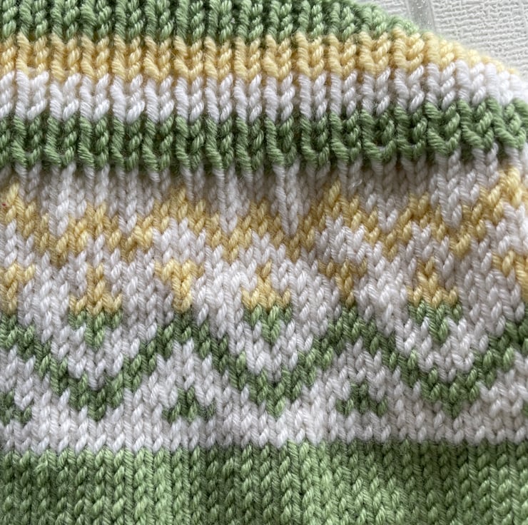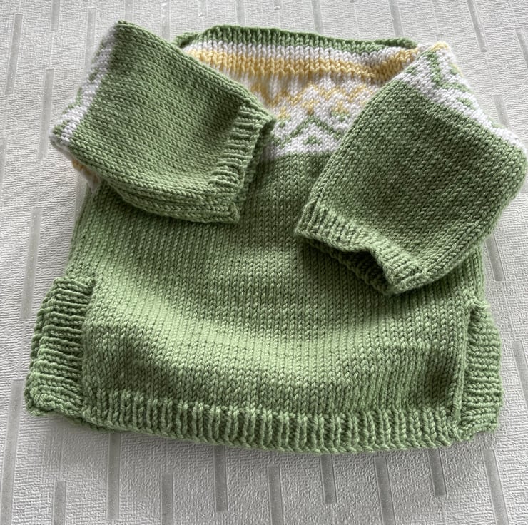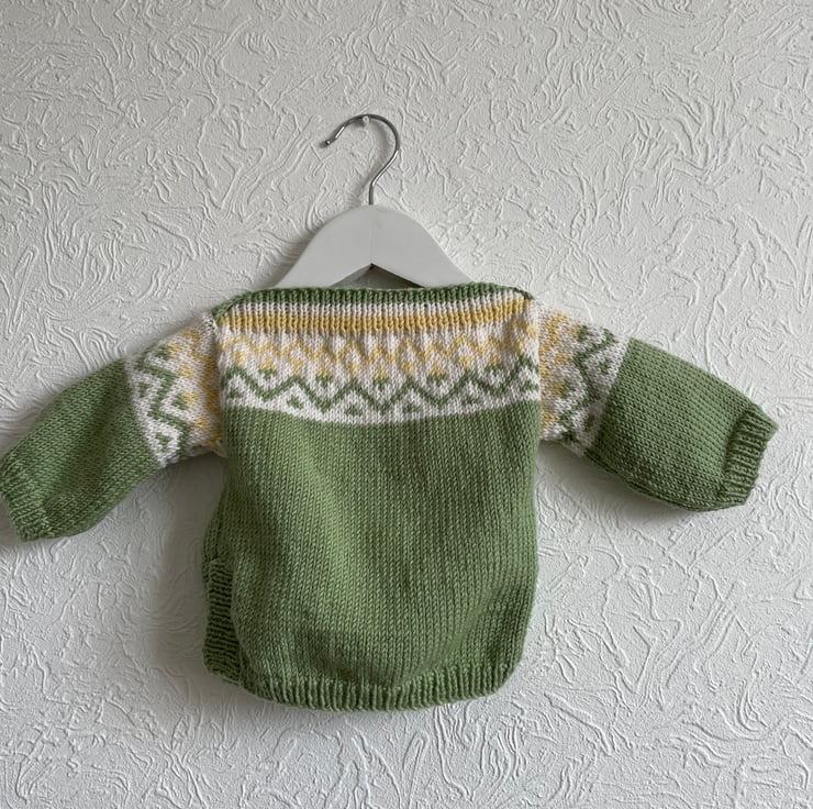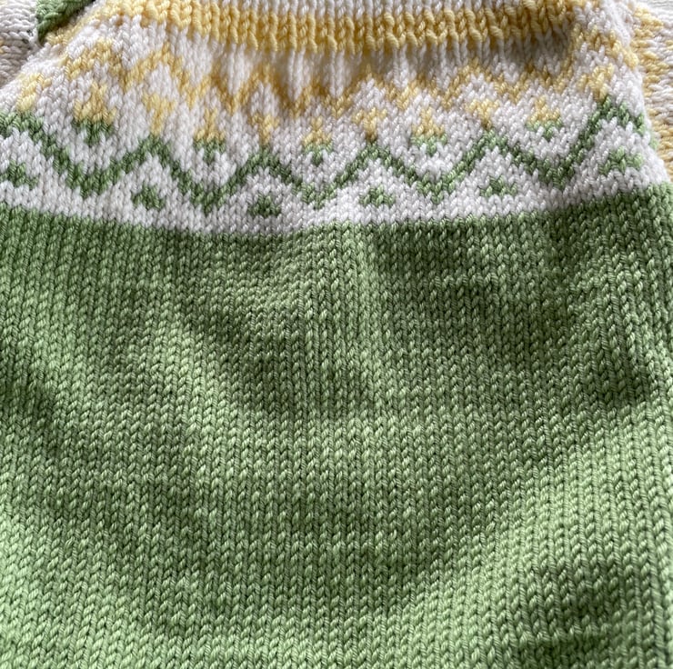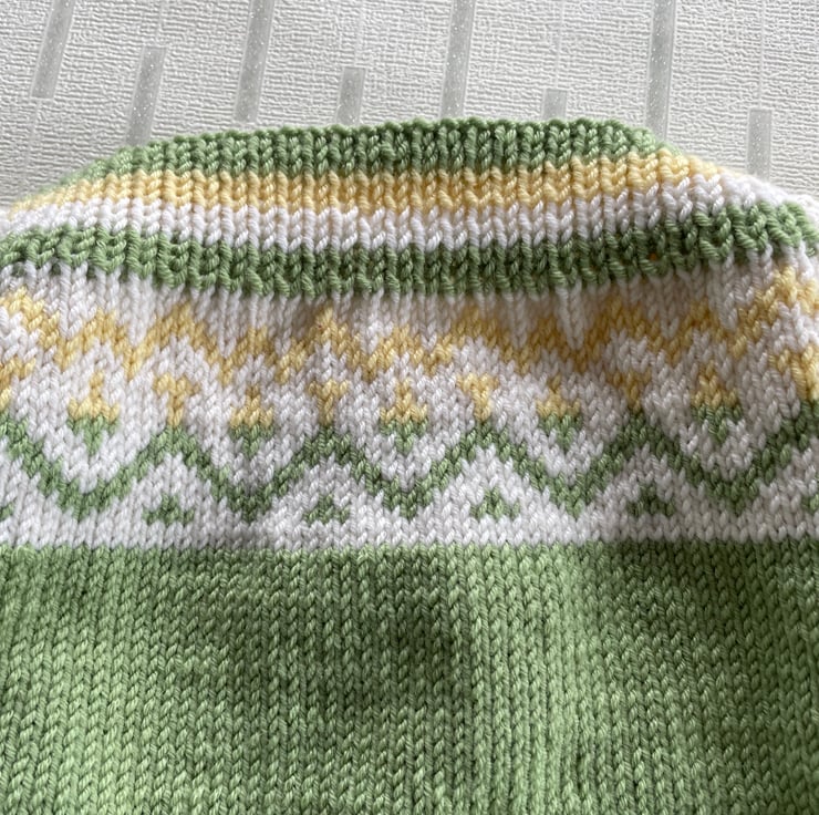 This jumper is hand knitted in a soft yarn containing cashmere using a vintage pattern. The main body of the jumper is apple green and it has a fair isle yolk worked in white and yellow. The bottom of the side seams is open with ribbed edges. It has a fold over neckline worked in the three colours.