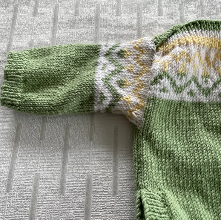 The pattern used is for a 3 month old baby and it measures 46cm round the chest, 25cm long and the sleeve seam is 15cm