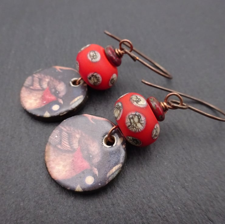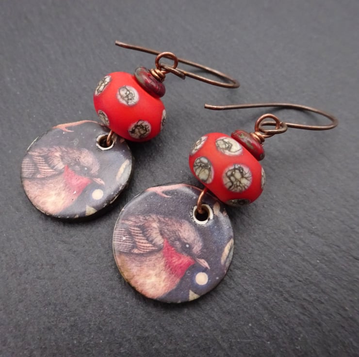 copper, lampwork glass and ceramic robin earrings