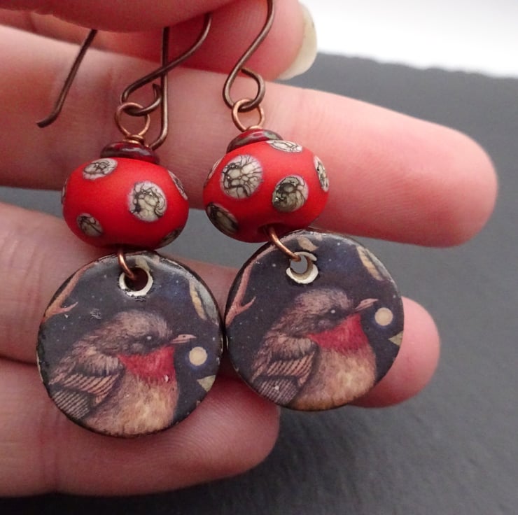 A pair earrings made with handmade copper ear wires, my handmade lampwork glass beads which are red/orange with ivory spots and handmade ceramic robin charms.