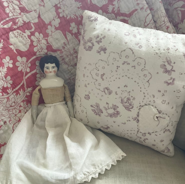 A gorgeous piece of vintage Cabbages and Roses has been used to make this small cushion. The design is called New Penny, and the front features a small applique quilt heart in the lower corner. An ideal size for displaying on a small antique chair, either on its own or displayed with an antique or handmade doll.