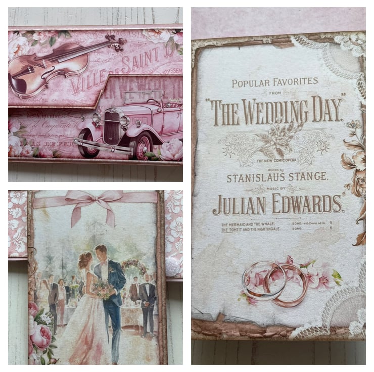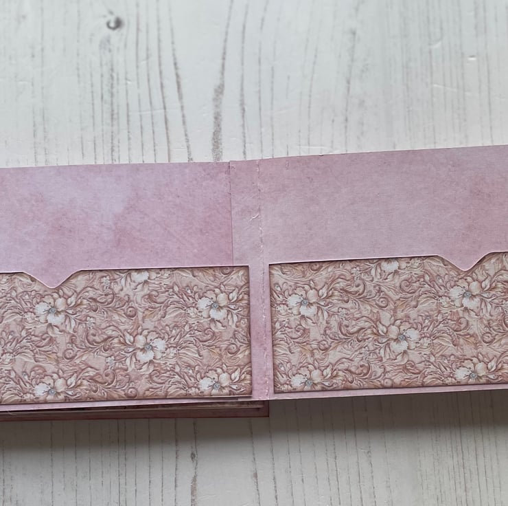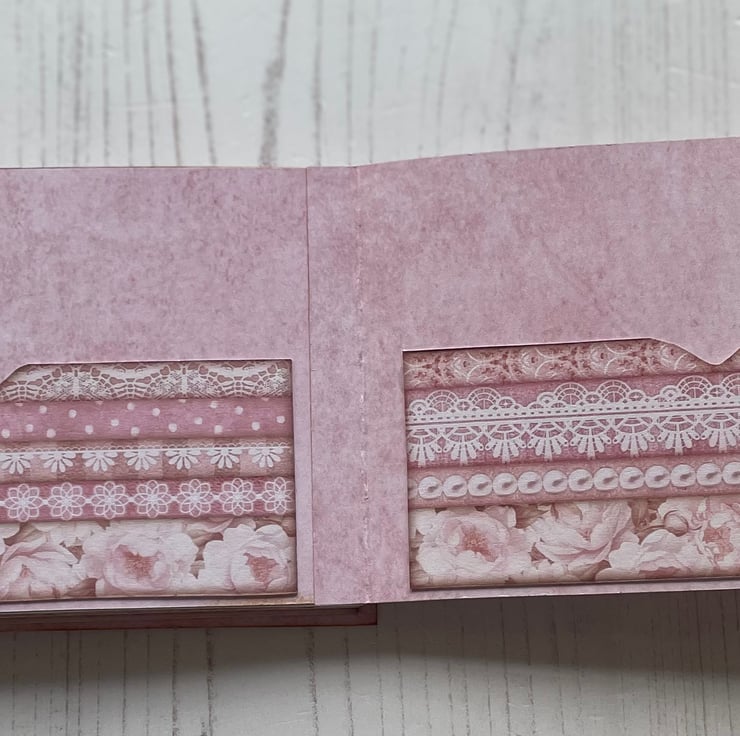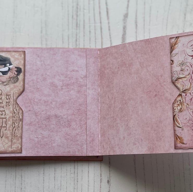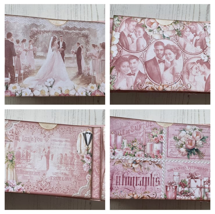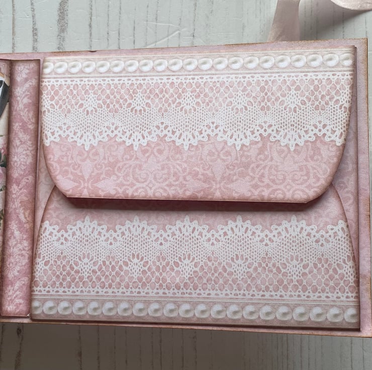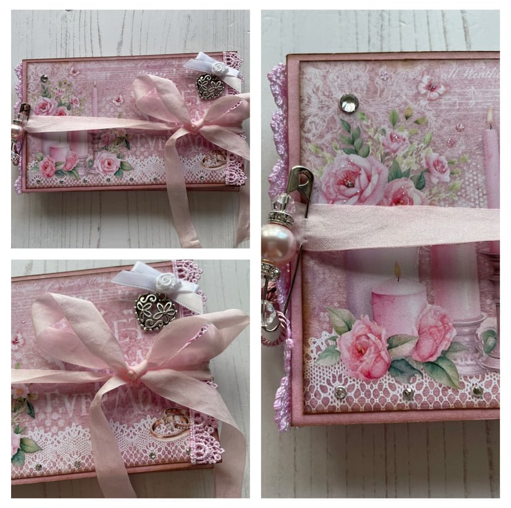 Small but pretty folio with flip out pages and pockets. To store memories of a special day. Cover is decorated with lace, diamantés, charms, bow, ribbon for tying, French pin with crystals and pearl with diamanté spacers. Inside front has a pretty envelope with hook and loop fasteners. Enclosed is a pretty card to add to the recipient’s.four flip out pages with tuck spots and a large pocket on the back. Back page has an envelope with a couple image for journaling. Measures 5.75” x 3.5” x 1/4”.