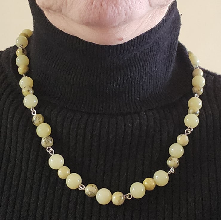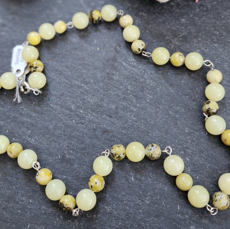 Yellow and variegated lemon jasper stones, 10mm & 8mm size alternating. Sterling silver connections and fastener. Measures just over 20inches / 52 cms in length.
