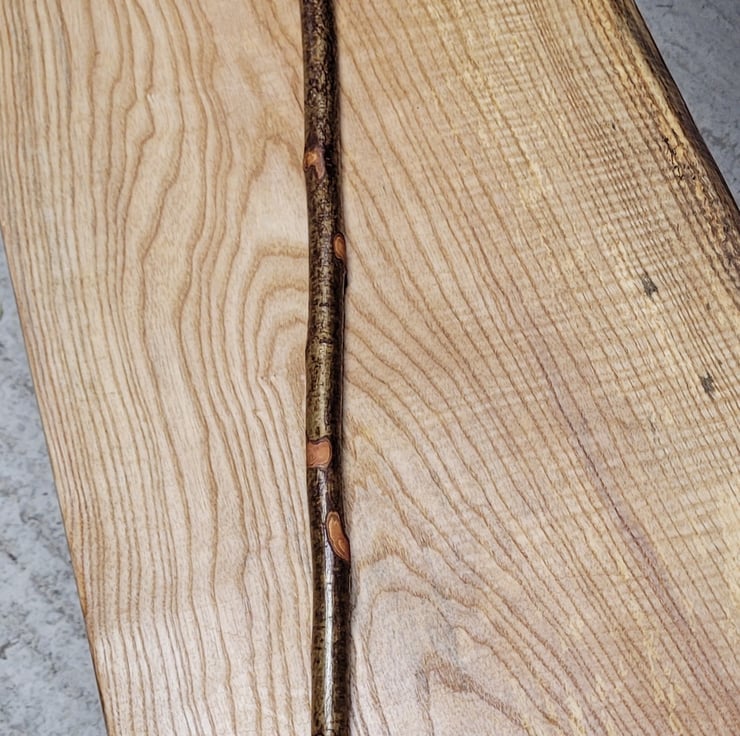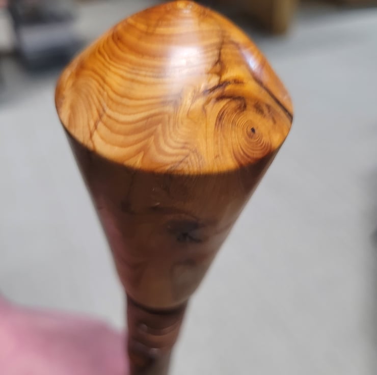 A diamond shape head turned by myself from welsh yew using a lathe here in my workshop in Pembrokeshire. Then attached to a hazel shaft and finished with a brass and rubber foot