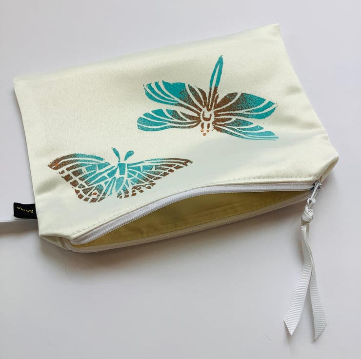 Our hand printed zip-up pouches made in luxurious Duchess Satin feature original block printed design with a tiny glimmer of metallic detail, printed on the front. The pouches are lined with water resistant lining to protect them from makeup mishaps. The lining adds a bit more colour and the brightness to each pouch.