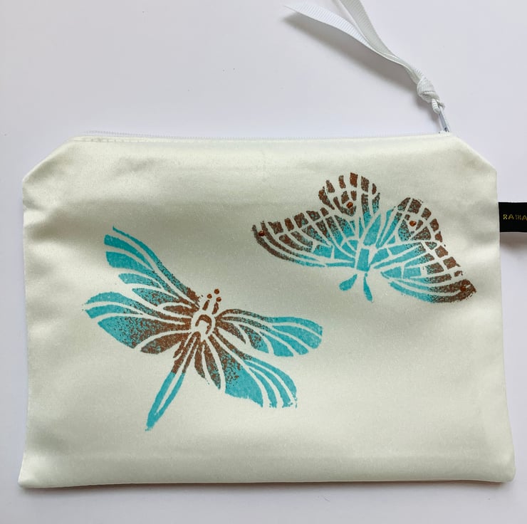 The captivating design features beautiful and elegant butterfly and dragonfly intricately hand carved into a lino cut block and hand printed on a rich satin background.